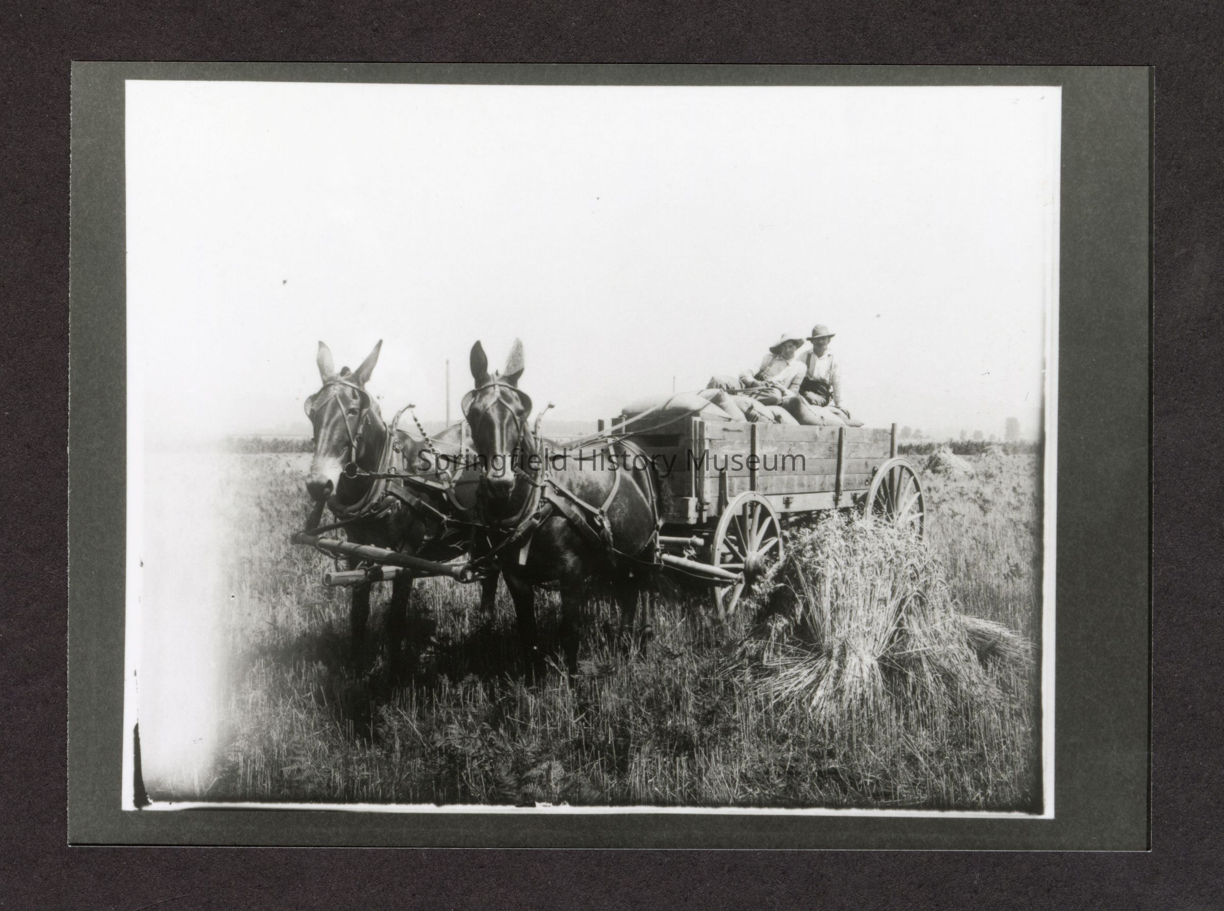 Photograph of Harvesting with Mules on Douglas Farm, Springfield. Two unidentified men sitting on top of grain sacks in a wagon pulled by 2 mules. A sheaf of grain is piled up neck to the wagon. Undated.