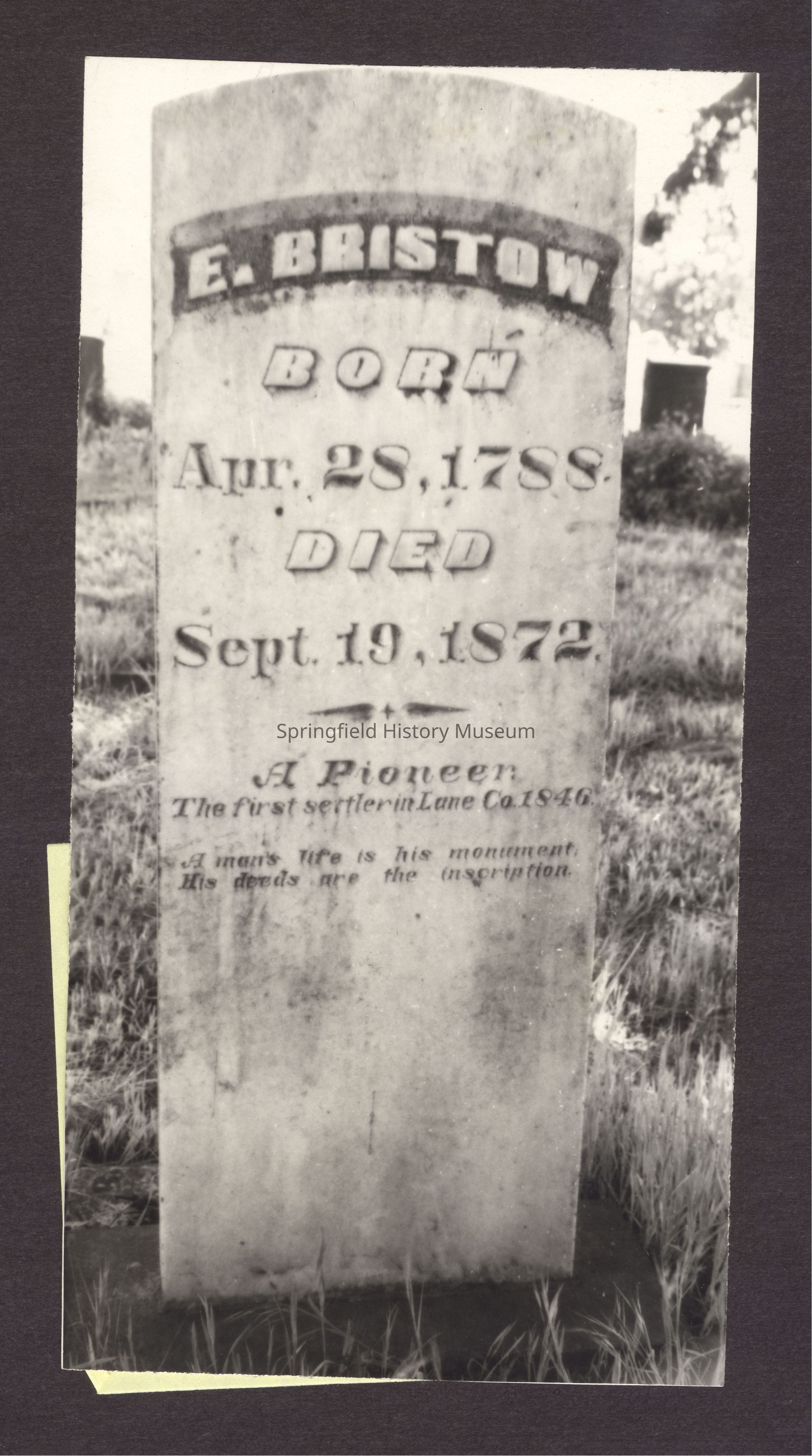 Photograph of headstone E. Bristow, Born April 28, 1788, Died September 19, 1872. Date unknown.Entry/Object ID