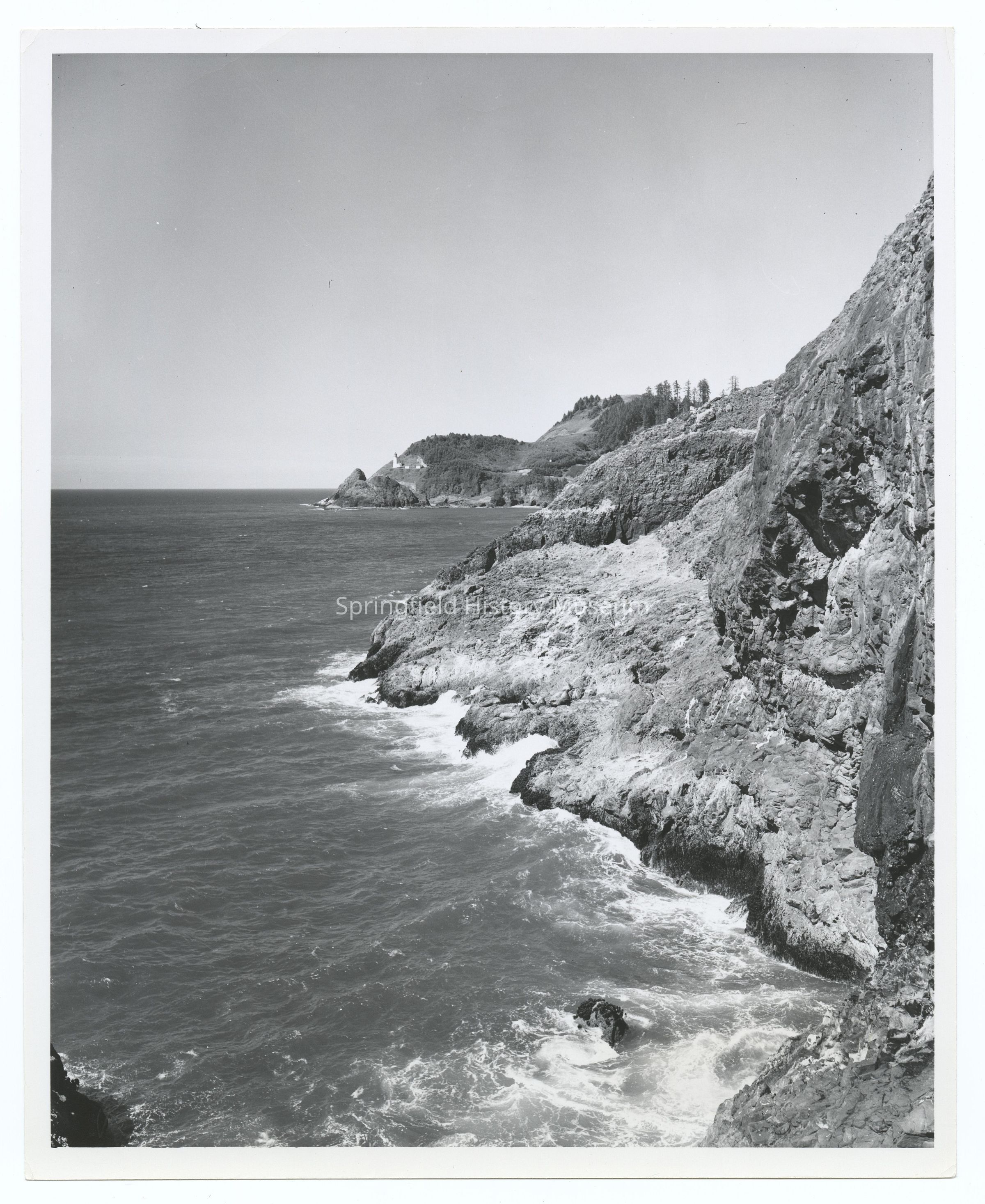 Photograph of Heceta Head Lighthouse and shoreline, North of Florence, undated, circa 1969Photograph Details
