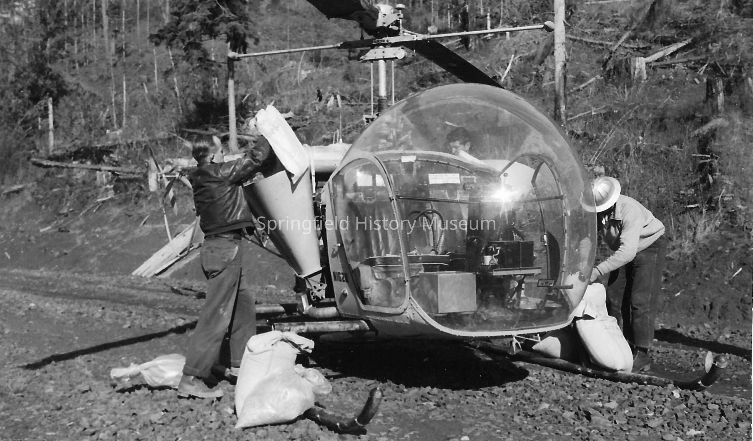 Photograph of a helicopter in the woods. Two men loading bags of spray onto hoppers, undatedCollection
