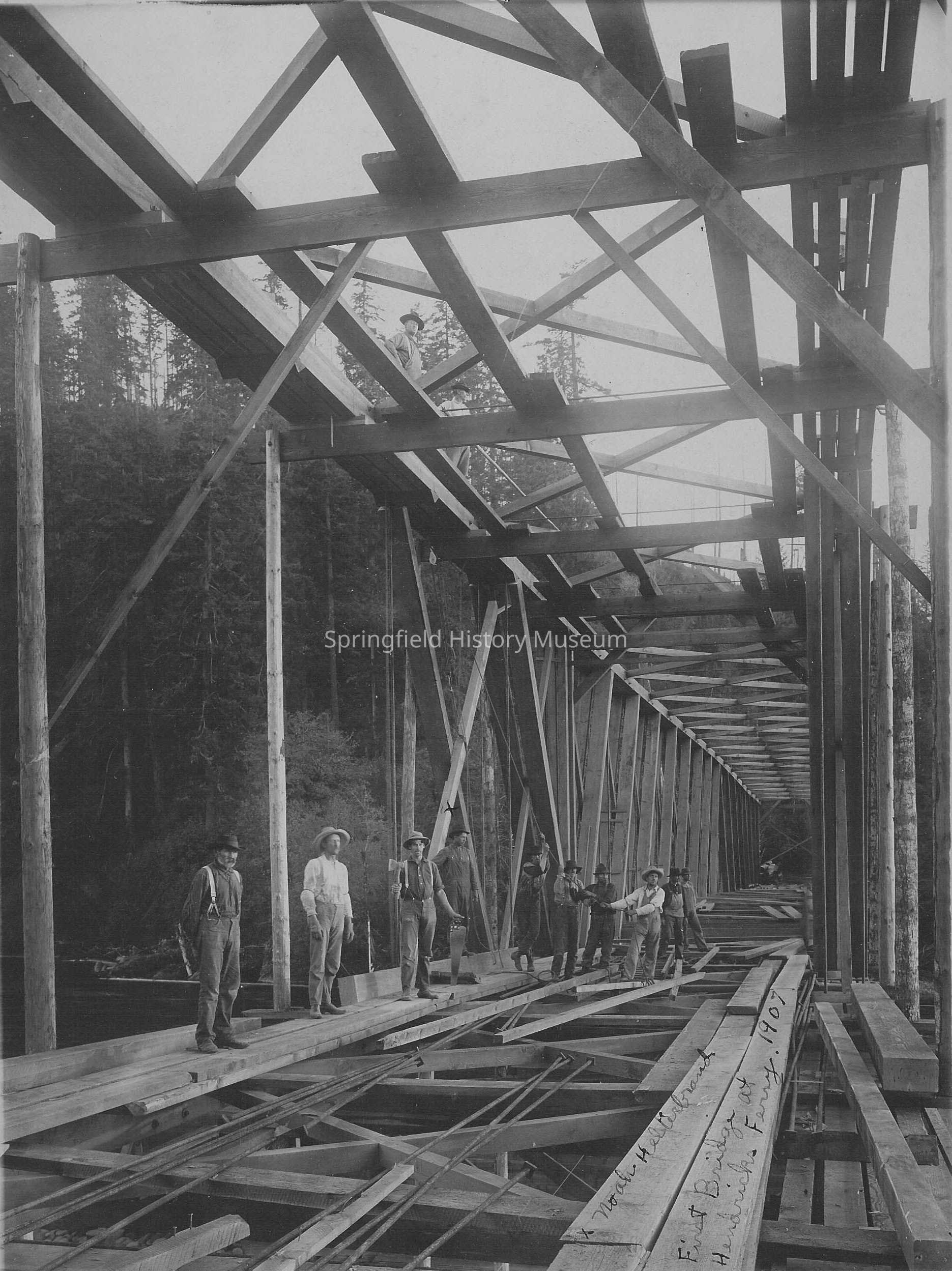 Photograph of Hendricks bridge at Hendricks Ferry built 1907. Group of men posed on new wood planking on side of bridge. Nearest man is standing with hands behind back, one man is holding a hatchet and saw, four men pulling on cable, and two men standing on top of bridge.