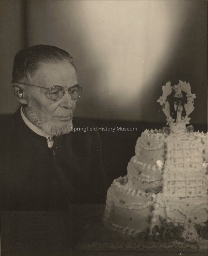 Man, Herman Ritter, seated beside a cake. Written on back: "Herman Ritter, minister in Mabel, Oregon. with 60th wedding anniversary cake." Man is wearing wire rim glasses and a hearing aid. Taken circa 1954.
