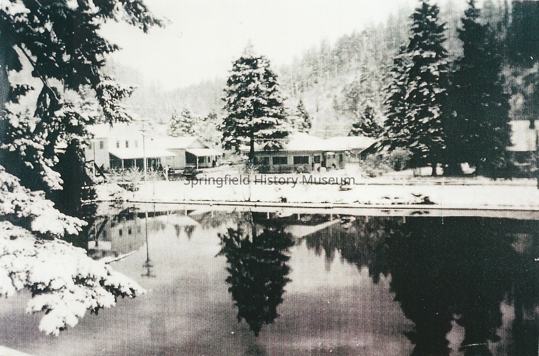 Westfir in snow, reflections in mill pond, Hines Lumber Company office in center, company store to left and post office behind.