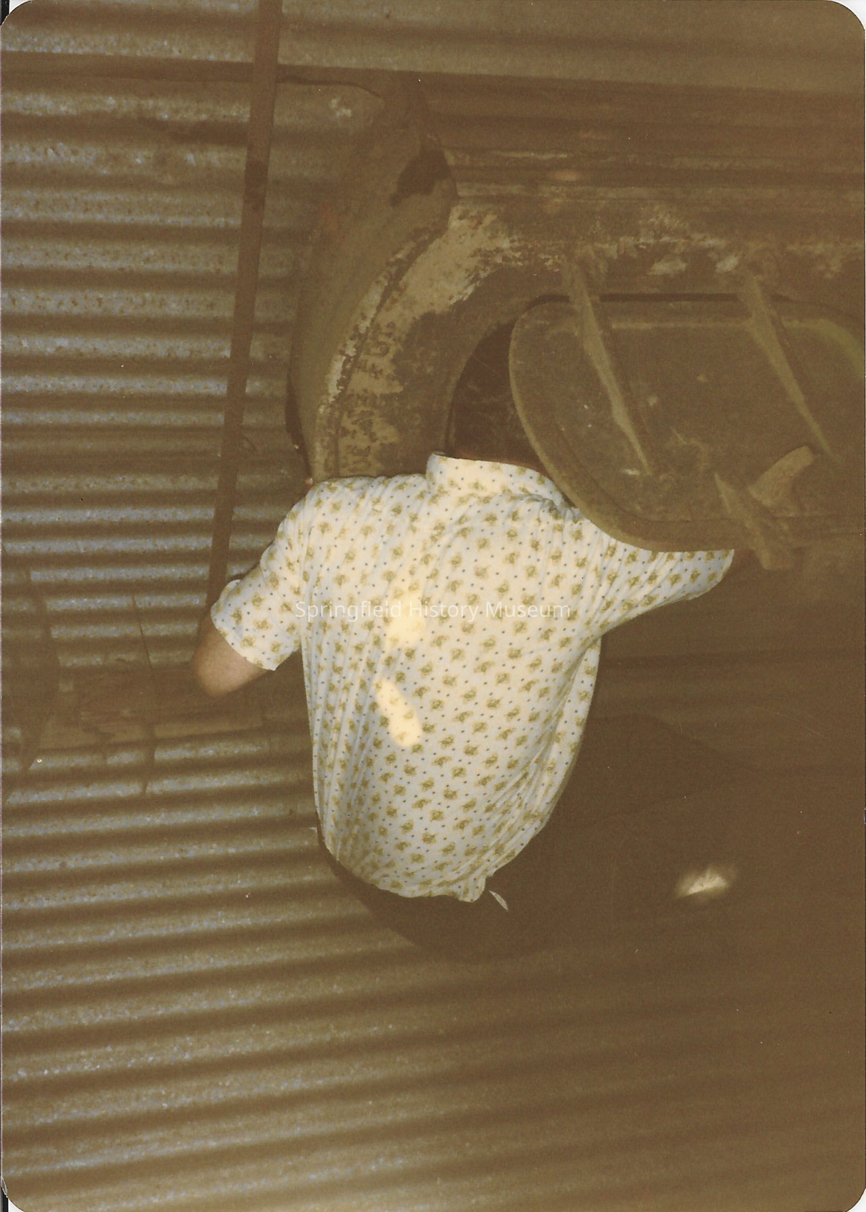 Ray Nott removing the door from a hop dryer at Randy Henderson's Thistle-Down Farm, 9145 River Rd., Eugene, Oregon;1981. This furnace door was used at Springfield Museum's first exhibit.