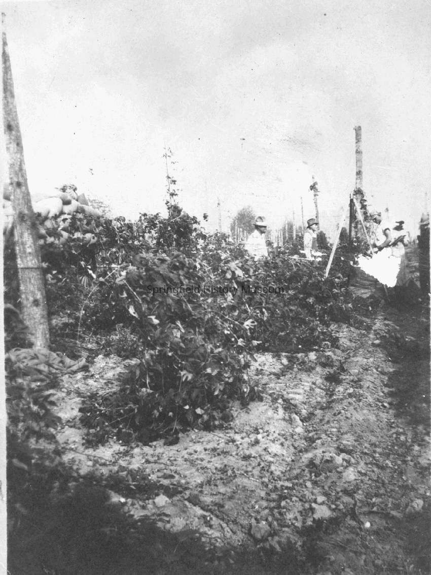Photograph of hop vines and workers