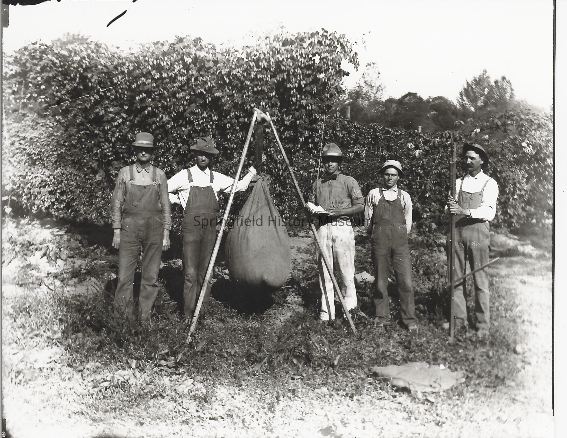 Photograph of Hopyard Workers (Mr. Ragsdale and Smith Mountjoy), undated. Five men in a hopyard weighing a full bag. Mr. Ragsdale and Mr Mountjoy included.Photograph Details