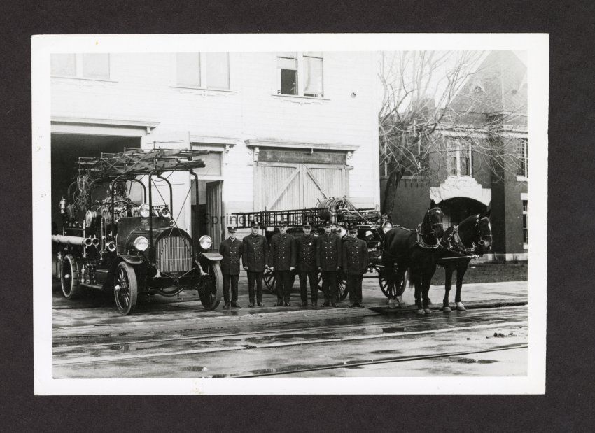 Written on the back by the donor's father Leland Davidson; "1913 Weber, Watson, Ferrel, Charles Croner, Nusbaum. Horse drawn fire wagon on right discontined. Chemical instead of pumper Operated from hydrants only. New Knott Fire Truck. First motorized vechicle and pumper, 750 pumper. When the Booth Kelly mill burned in Springfield in 1911. This team and fire wagon responded. After running the horses at a full gallop the 3 miles. The horses were covered with white lather. The men rubbed them down and blanked them. The famous run was of no use, too far to hook up with a hydrant and being chemical insteaf of pumper it just sat there of no use. A later model of pumper could have drawn water from the millrace."Copyright