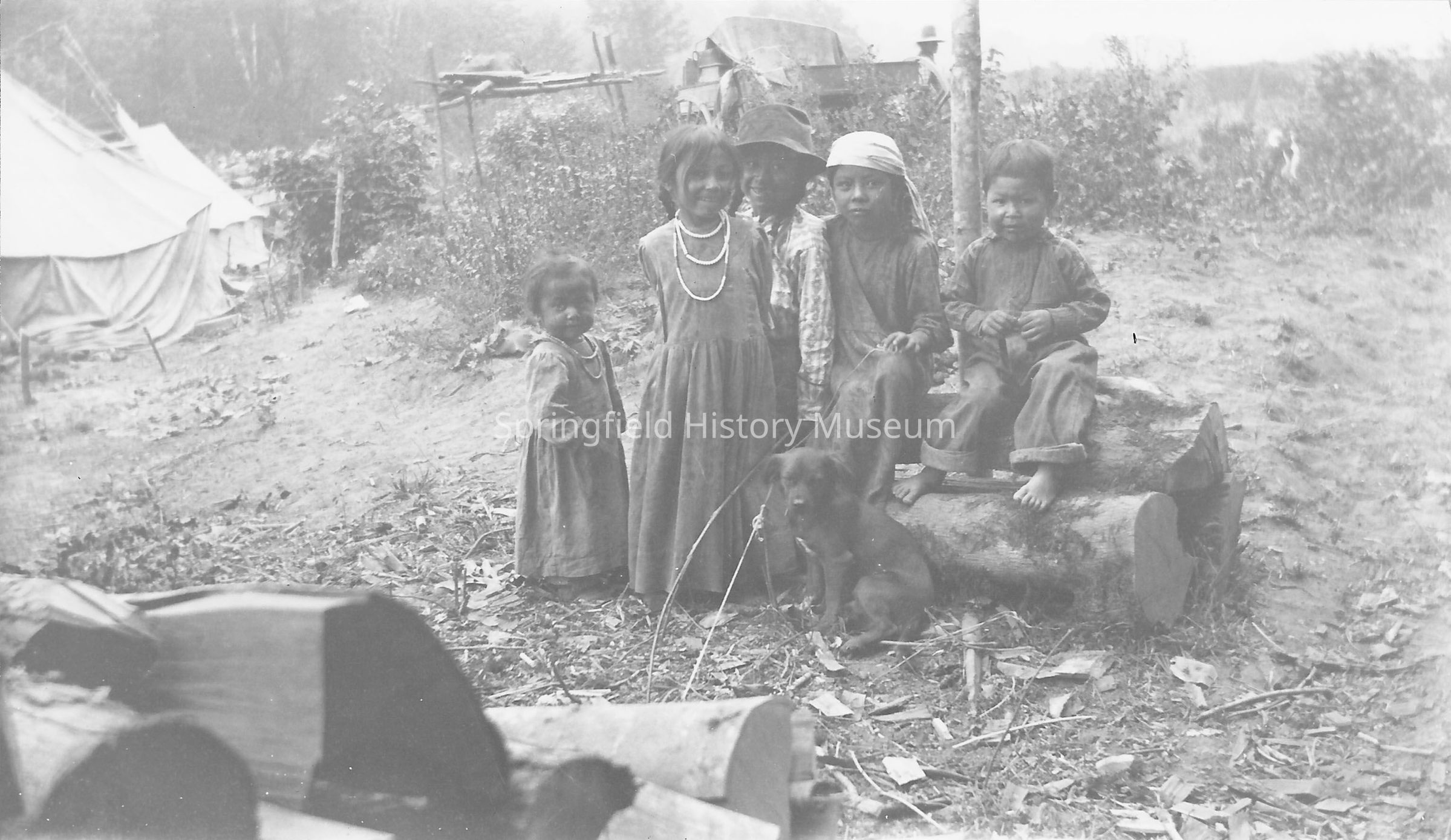 Seavy Hop Yard, five Native American (likely from the Grand Ronde or Warm Springs reservations) children and a dog.