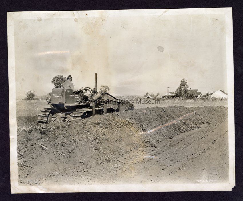 Black and white photograph of Inter-city equipment moving dirt on street construction, same man and site as 2021.007.002-3, which places it in Springfield, circa 1950. The equipment says "International TracTracTor - International Diesel."Copyright