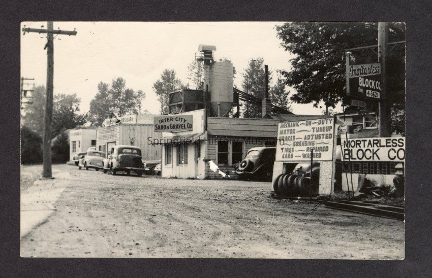Black and white photograph of Intercity. Willamette Graystone just beginning (brick place next door in photo), Redimix plant behind. From left: [illegible] Co., Hides-Wools-Furs-Bark, Inter-City Sand & Gravel Co., Mortarless Block Co. Handwritten on back, "Intercity about 1950. Steve Moe" & contact info.Collection