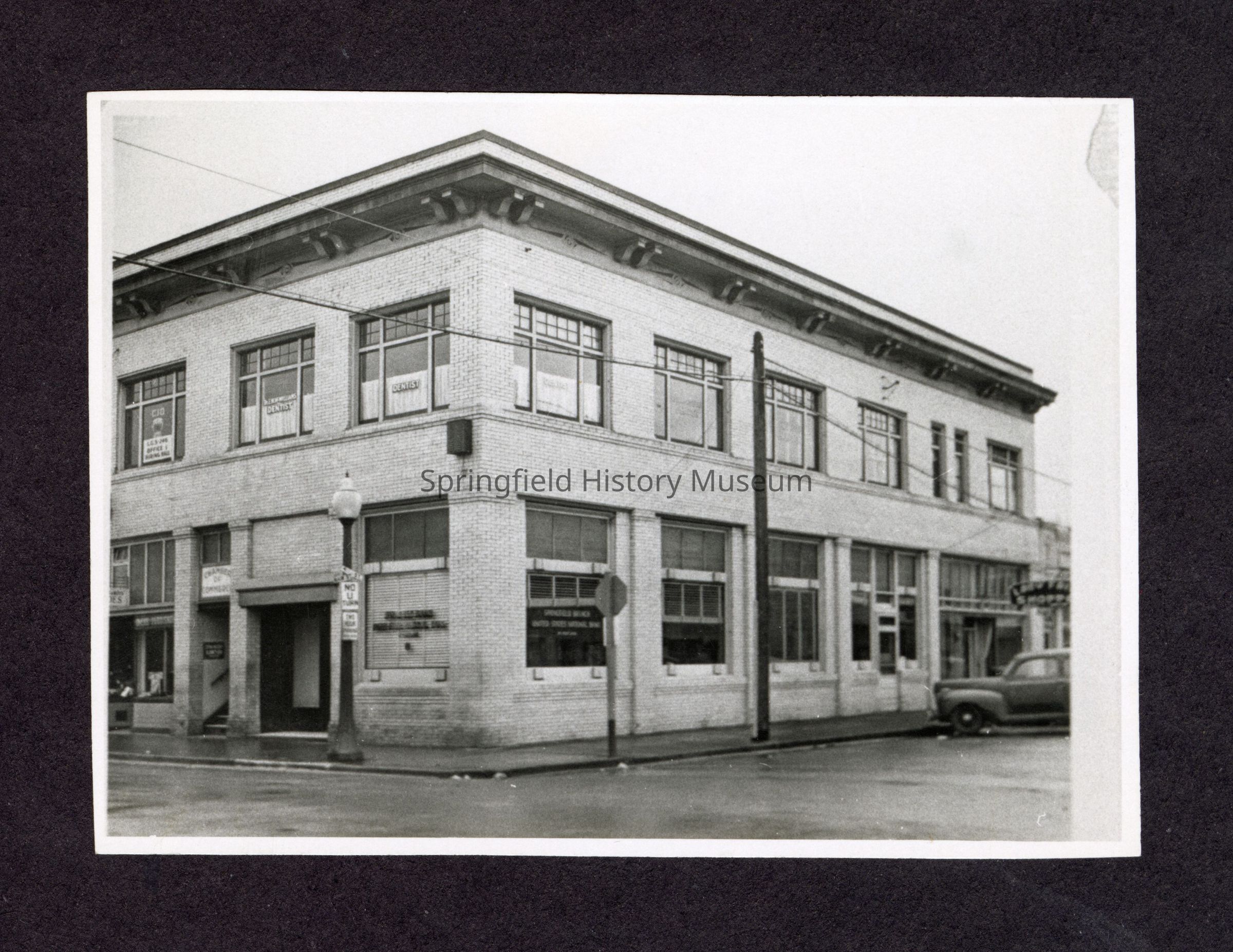 Black and white photograph of a two-story brick building on a corner with the Springfield Branch of a bank(?); a dentist, and the Chamber of Commerce. There is a truck parked on the right. Undated.Collection
