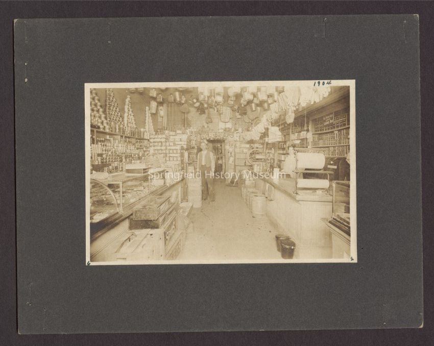 Photograph of the interior of J J Bryan Store, 1904. Photograph is mounted on cardboard. Image is identical to 2017.003.518, but has been dated "1904" in upper right corner, and "J.J. Bryan store 1904" written on back in pencil.