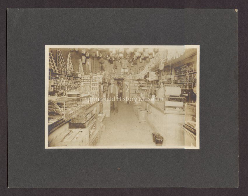 Photograph of the interior of J J Bryan Store, 1904. Photograph is mounted on cardboard.