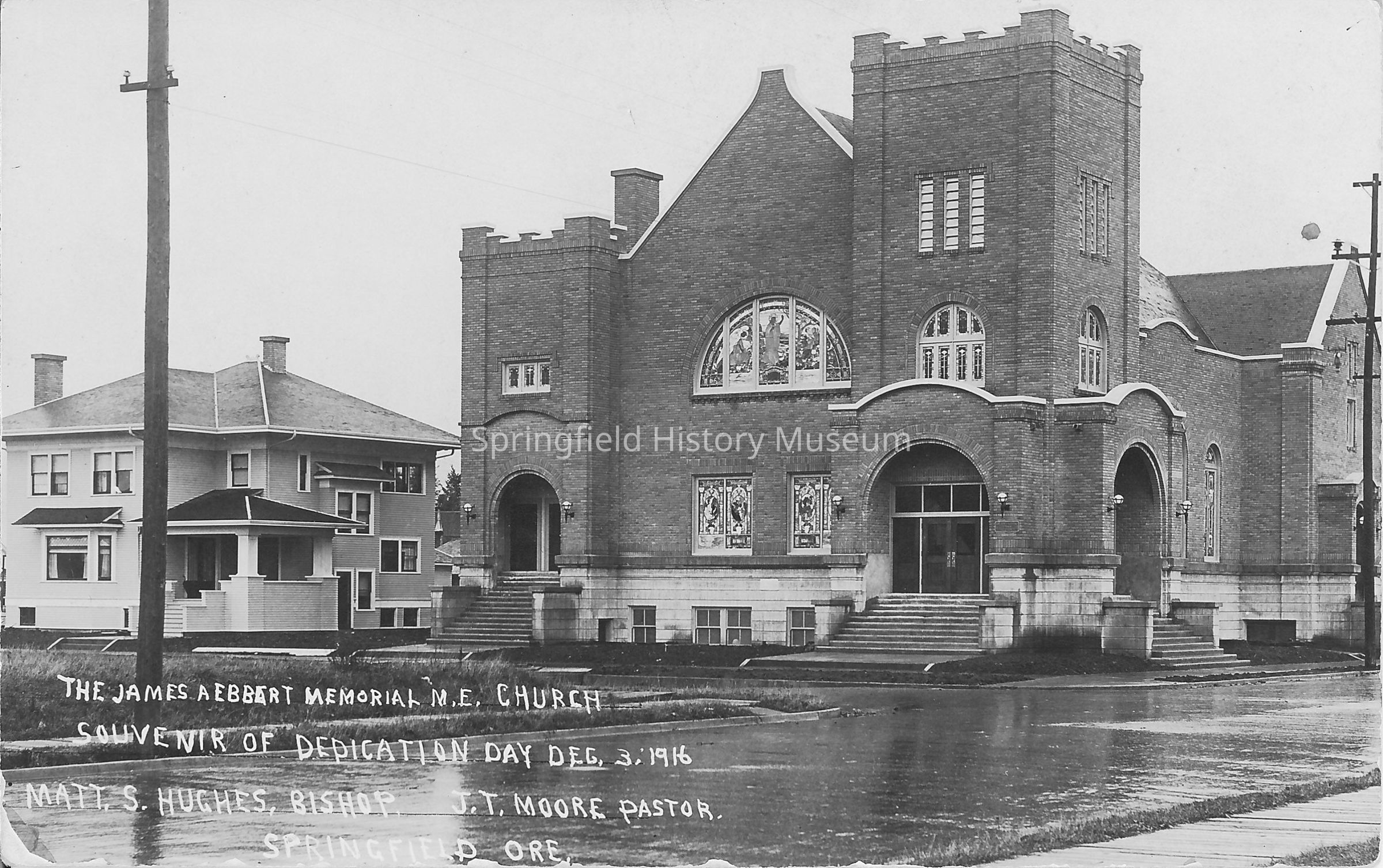 James A. Ebbert Memorial Methodist Episcopal Church in Springfield, Oregon. Souvenir of Dedication Day; December 3, 1916; Matt S. Hughes, Bishop; J. T. Moore, Pastor.
