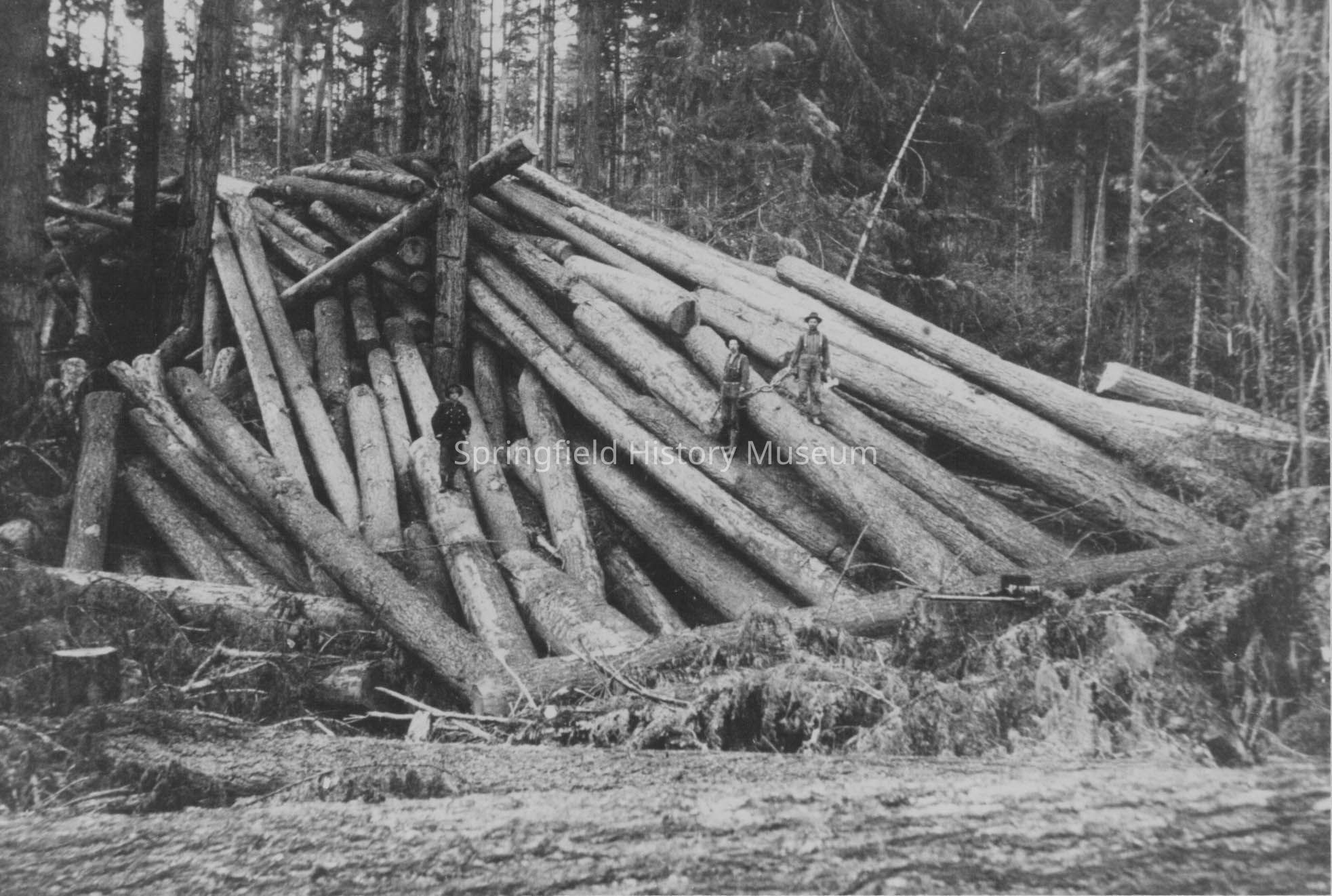 Logging, Goodman Place, Willamette River, Jasper Hills Logging Camp, Pleasant Hill Region, Log Pile, Loggers, Logging--Camps--Jasper Hills Logging Camp, Waterways--Willamette River, Pleasant Hill Region--Jasper, Logging--Personnel, People--Groups & Individuals