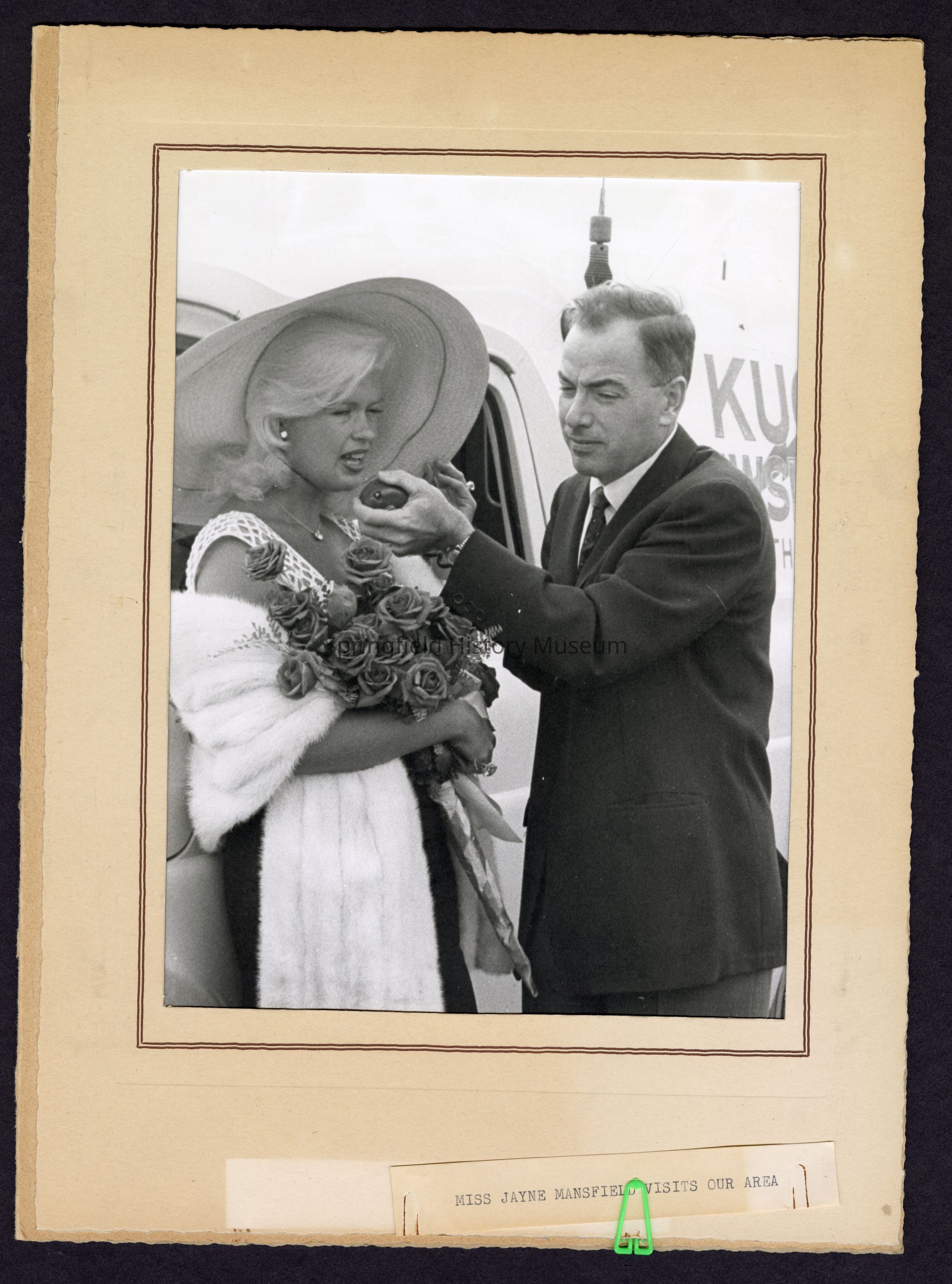 Photograph of Jayne Mansfield, "Miss Jayne Mansfield Visits Our Area." Date unknown.Entry/Object ID