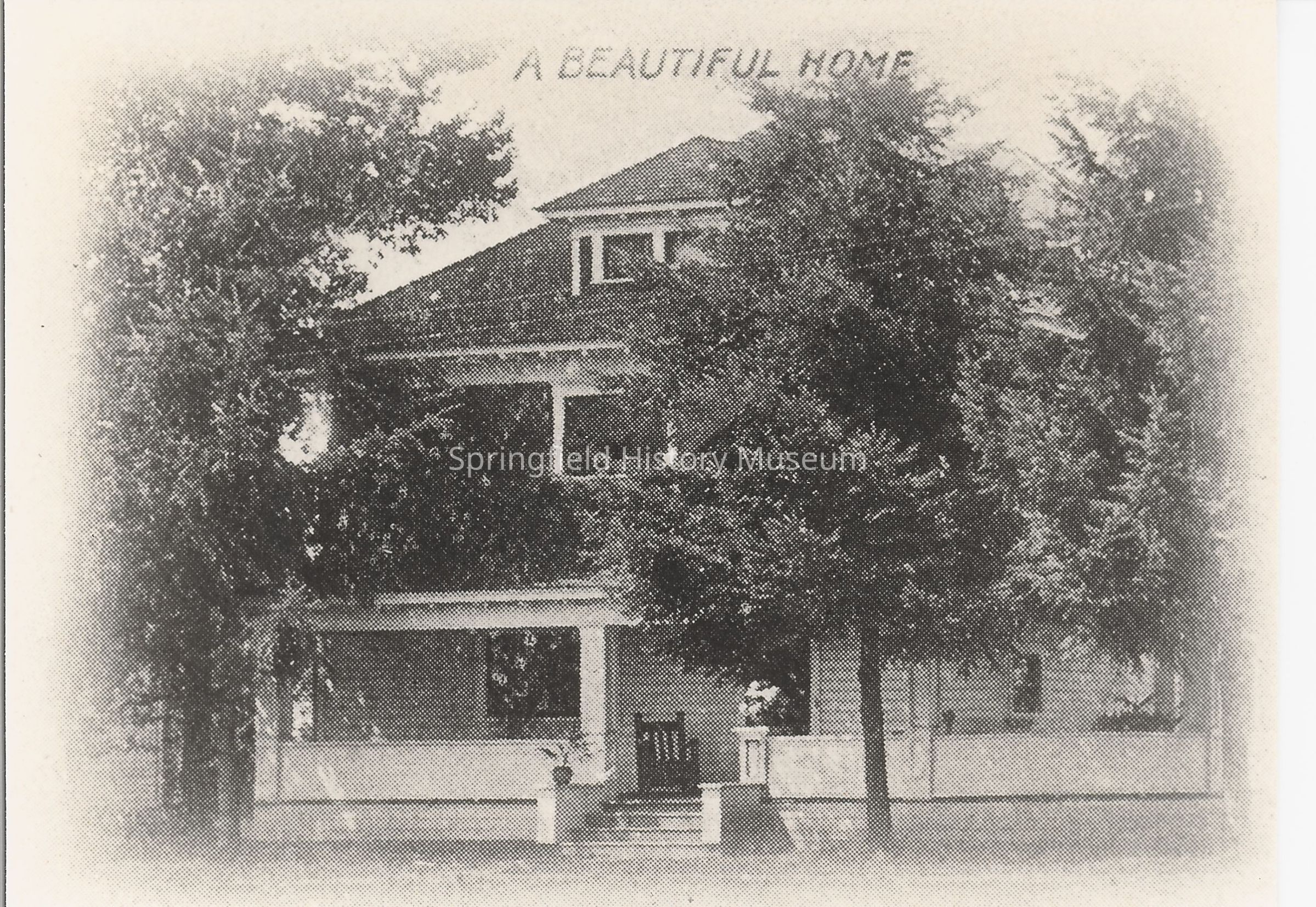 Large house with trees in the foreground, "A Beautiful Home" written above the house. Jess Seavey House located at 448 D Street.