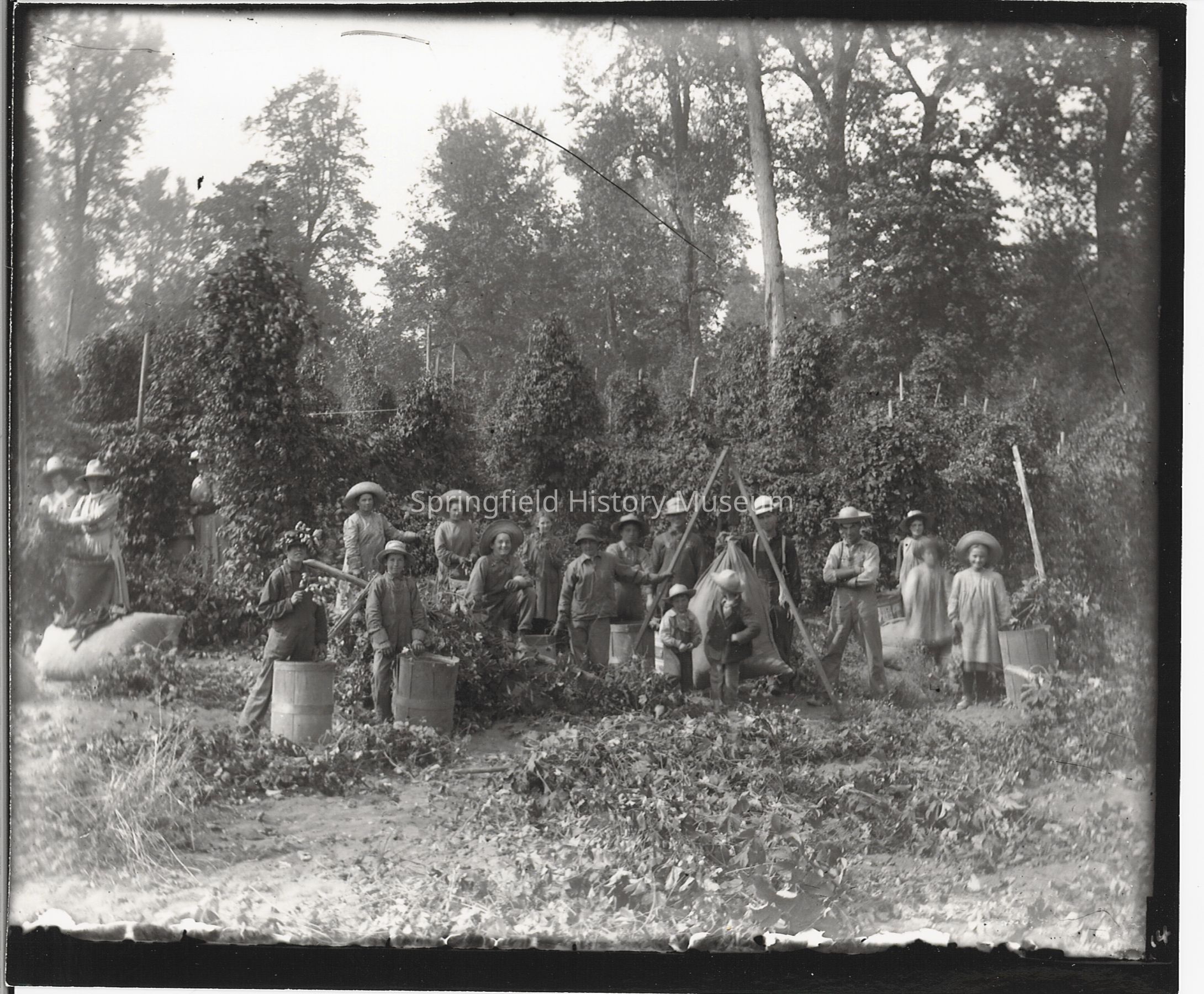 Group of people in John Kelsey hopyards, undated.