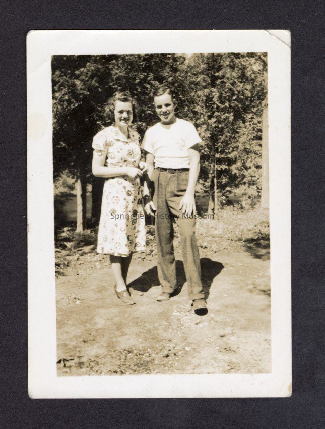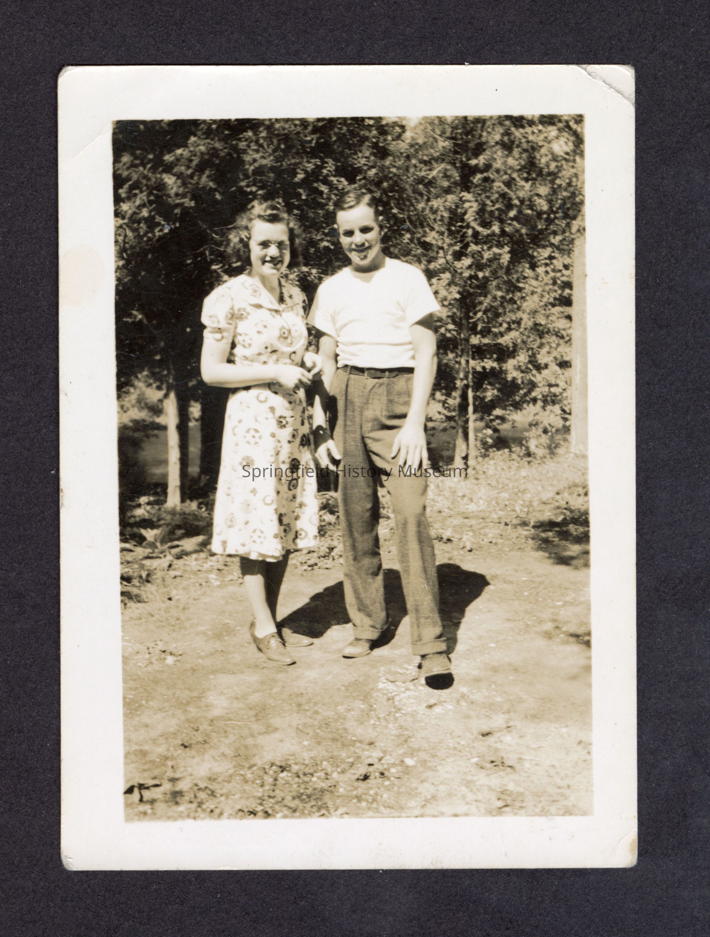 Photograph of a young woman and man, at a river, circa 1937. Possibly Ken and Barbara Leighton, see 2003.055.027Photograph Details