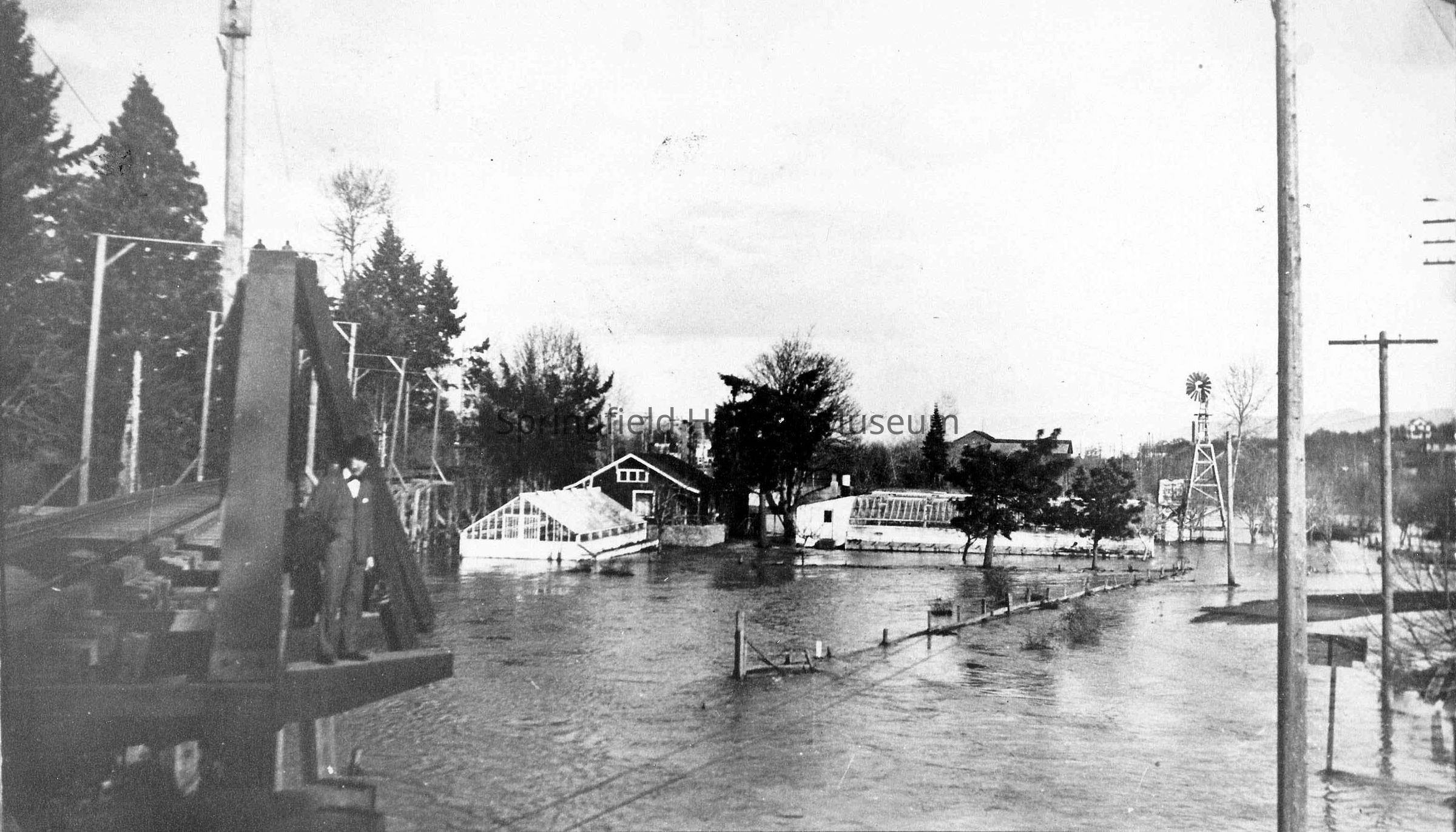 Transcribed inscription on back: "Kingwell Greenhouses, Old Street car bridge, early 1920s. West Springfield at flood time. Fence marks the highway to Eugene. Willamette Heights at upper right."Photograph Details