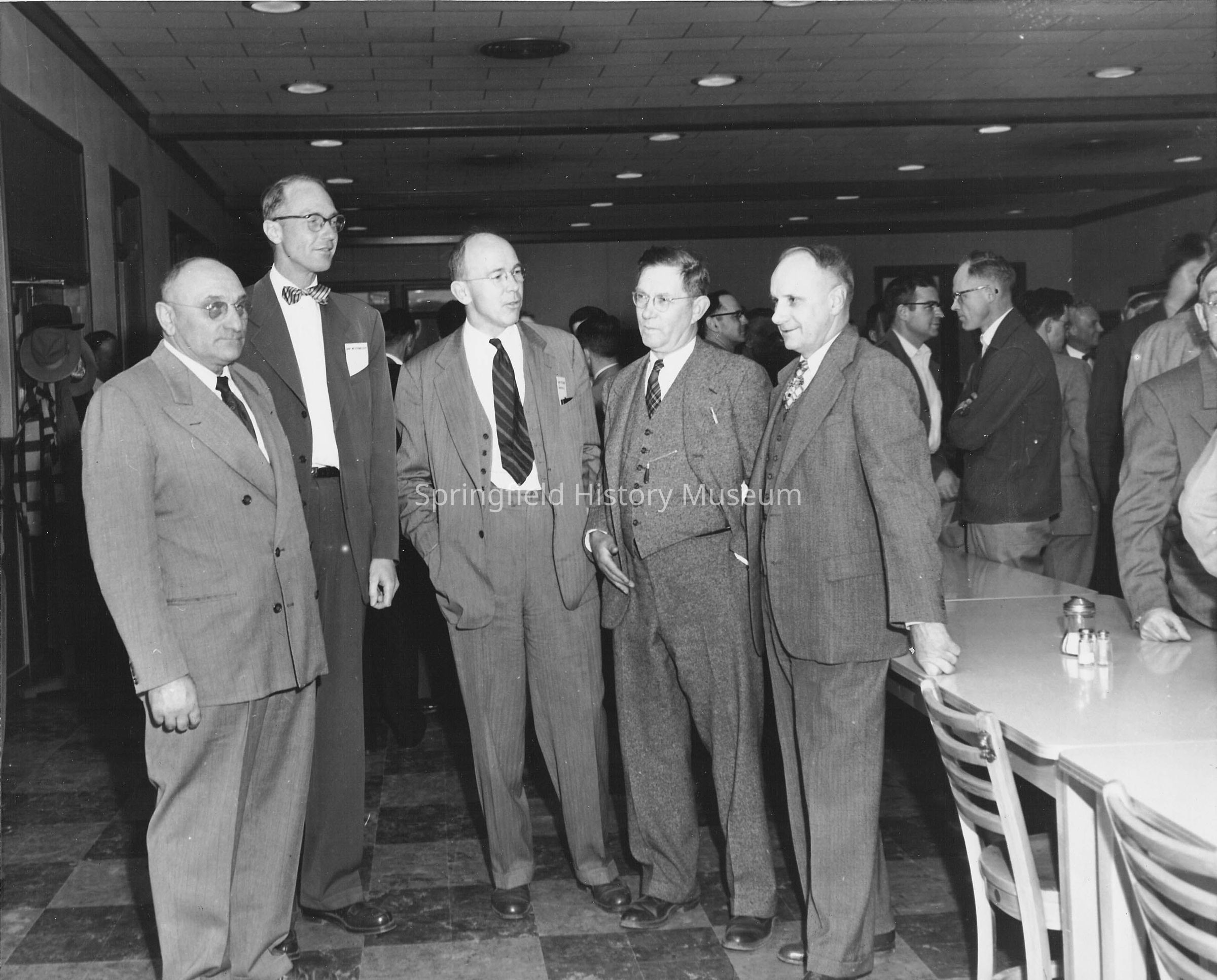 Members of Lane County court on tour at Weyerhauser sawmill and pulp mill during the company's annual forestry meeting. They are in the mill cafeteria. "Photo Collection, Crystal B. and V. D. Fogle, Springfield, Ore" stamped on back. Undated.