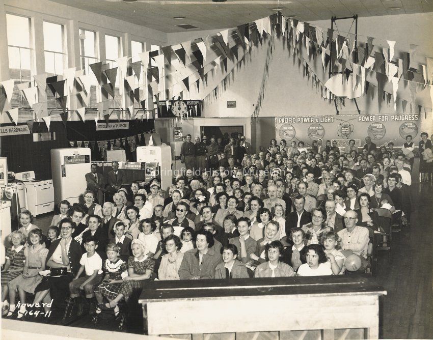 Photograph of Springfield Electric Appliance Show held Willamalane Memorial Building, 1954. Large sign across back of room: Pacific Power & Light, Power for progress. People are still coming through the door in back of room.