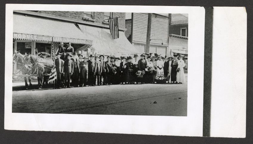 B&W Photo of A large group of people standing in the street with a American flag. and behind them a team of horse and wagon.Collection