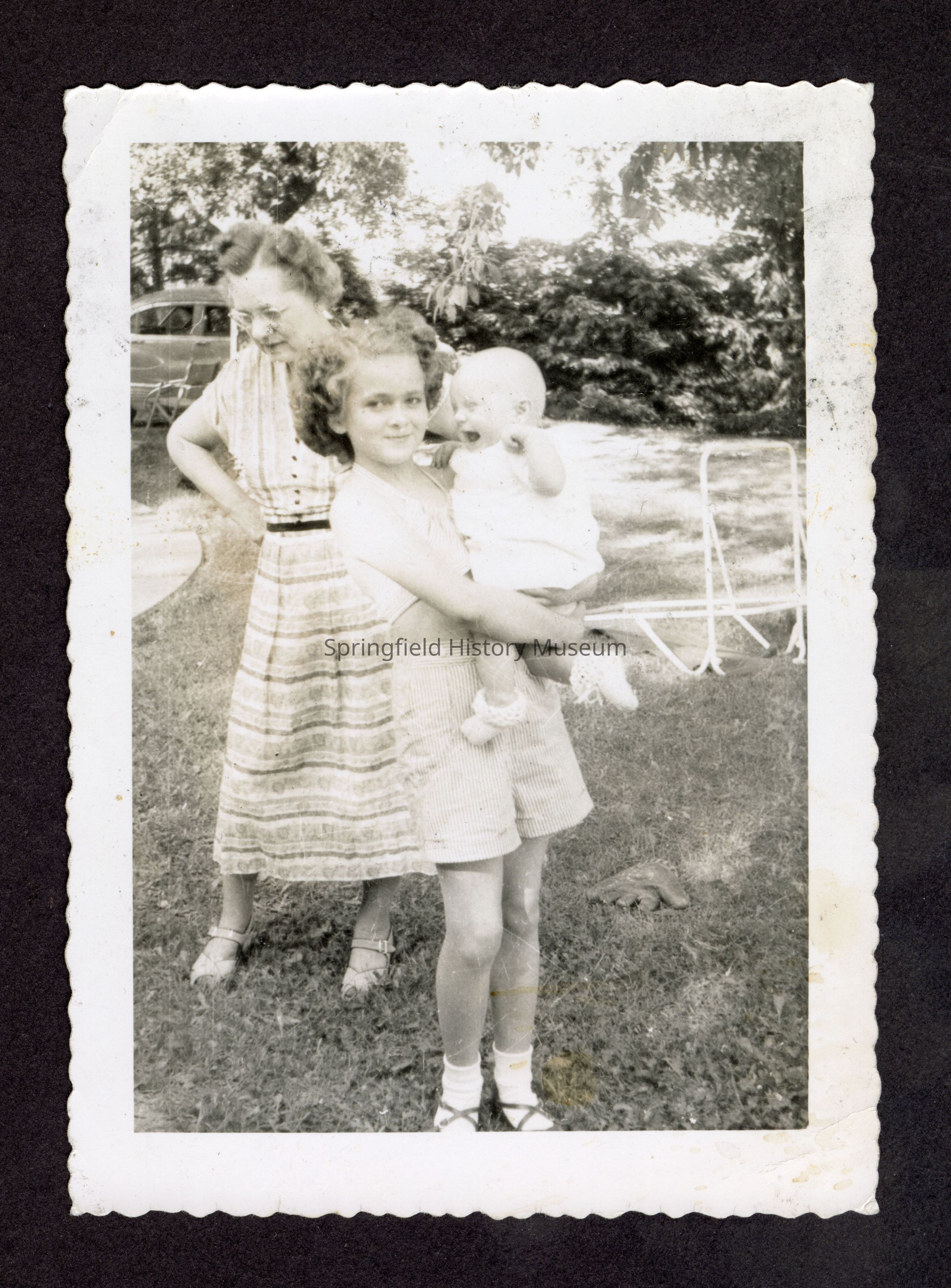 Photograph of Leona Myers (back) and two Myers children, 1951. Goes with 2003.055.076.