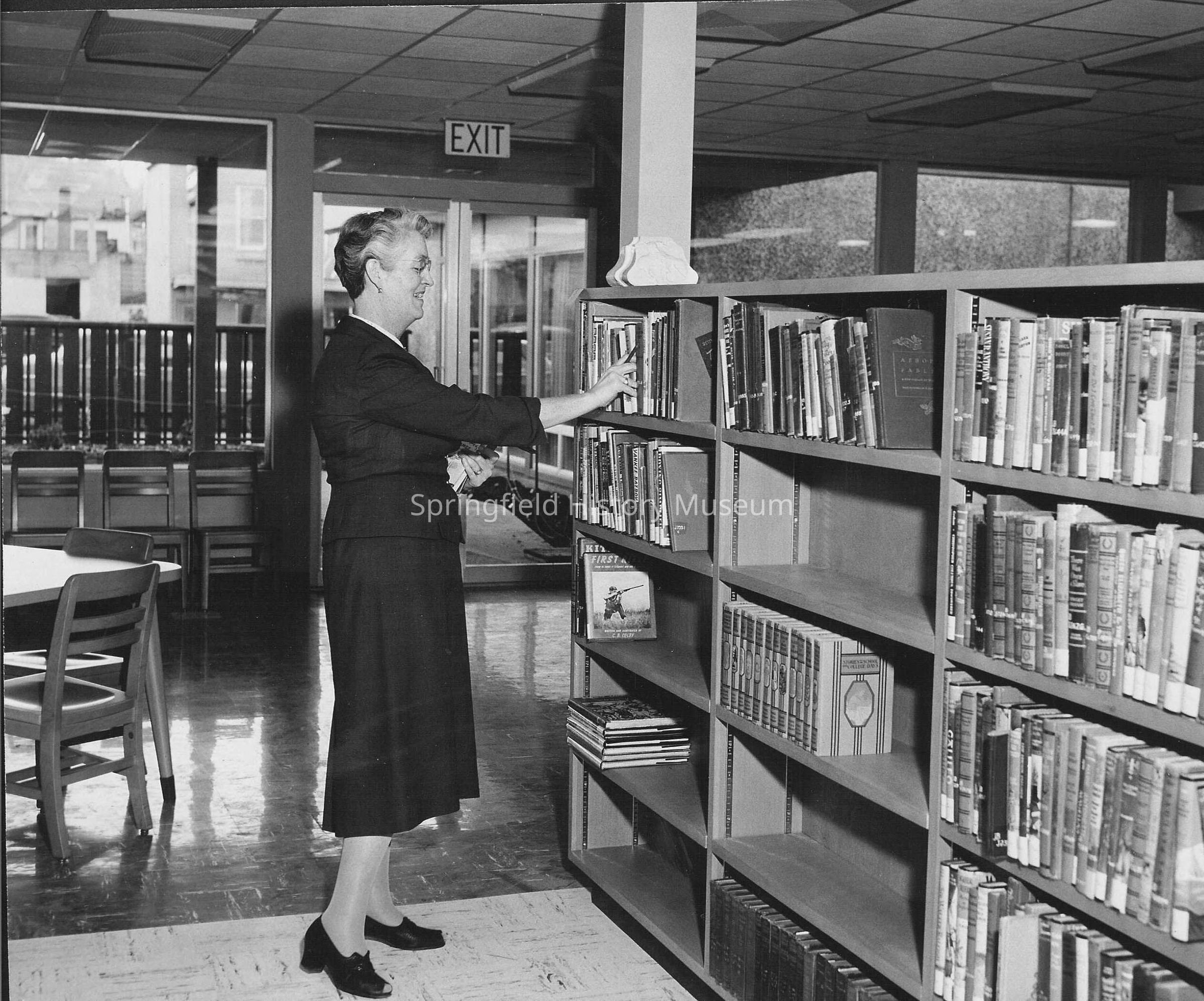 People, Buildings, Springfield Public Library, Librarian, Staff, Personnel, Bookshelves, Library Interior, Veva Morgan, Buildings--Springfield Public Library--Personnel, People--Groups & IndividualsRelationships