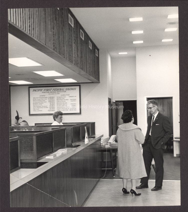 B&W Photo of lobby of Pacific First Federal Savings with 3 people standing.