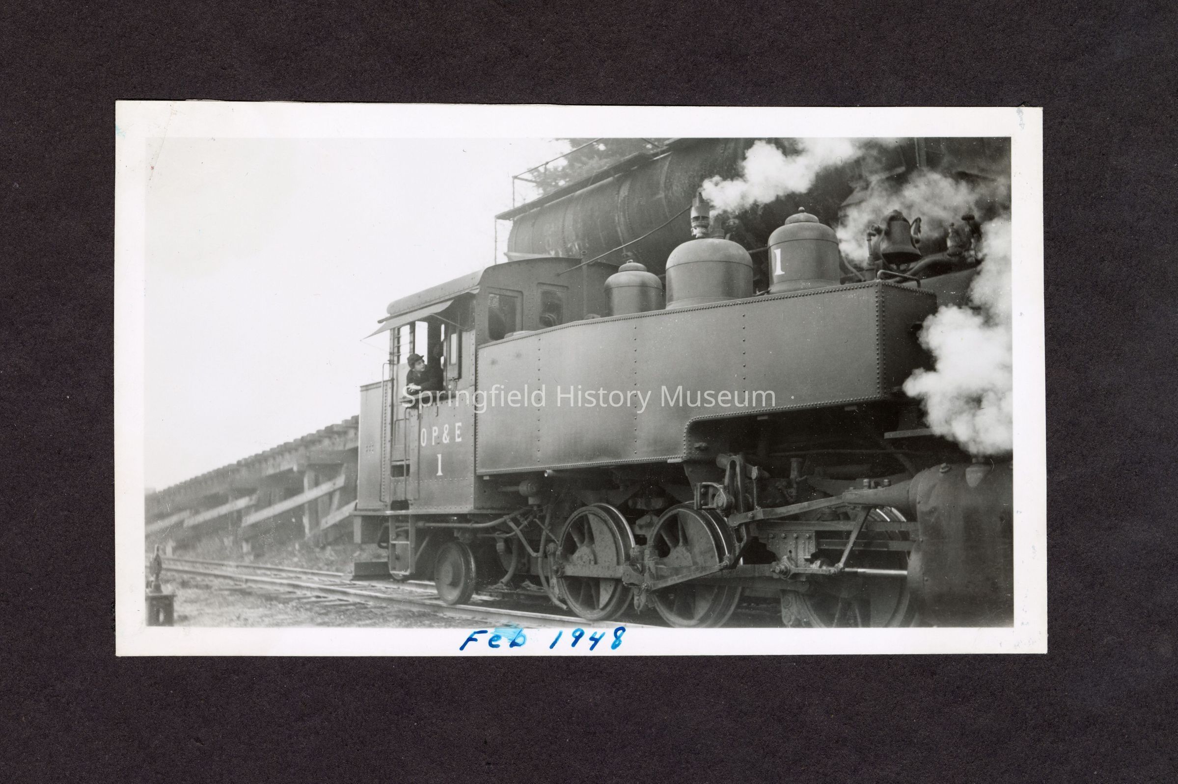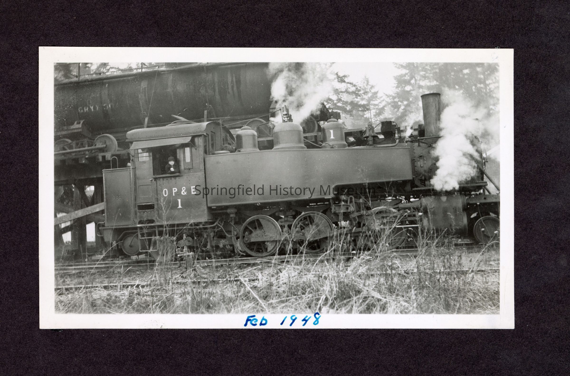 Photograph of locomotive OP&E 1 dated "Feb 1948" OP&E R.R. the company rearranged in 1940 and Booth-Kelly Lumber Co. purchased railroad in 1947