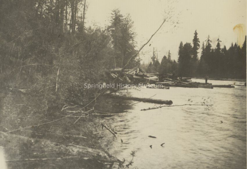 same photograph as 1979.002.007 but that photograph described as a log drive on the Willamette, low water stopped drive as stated on back of that photographCollection