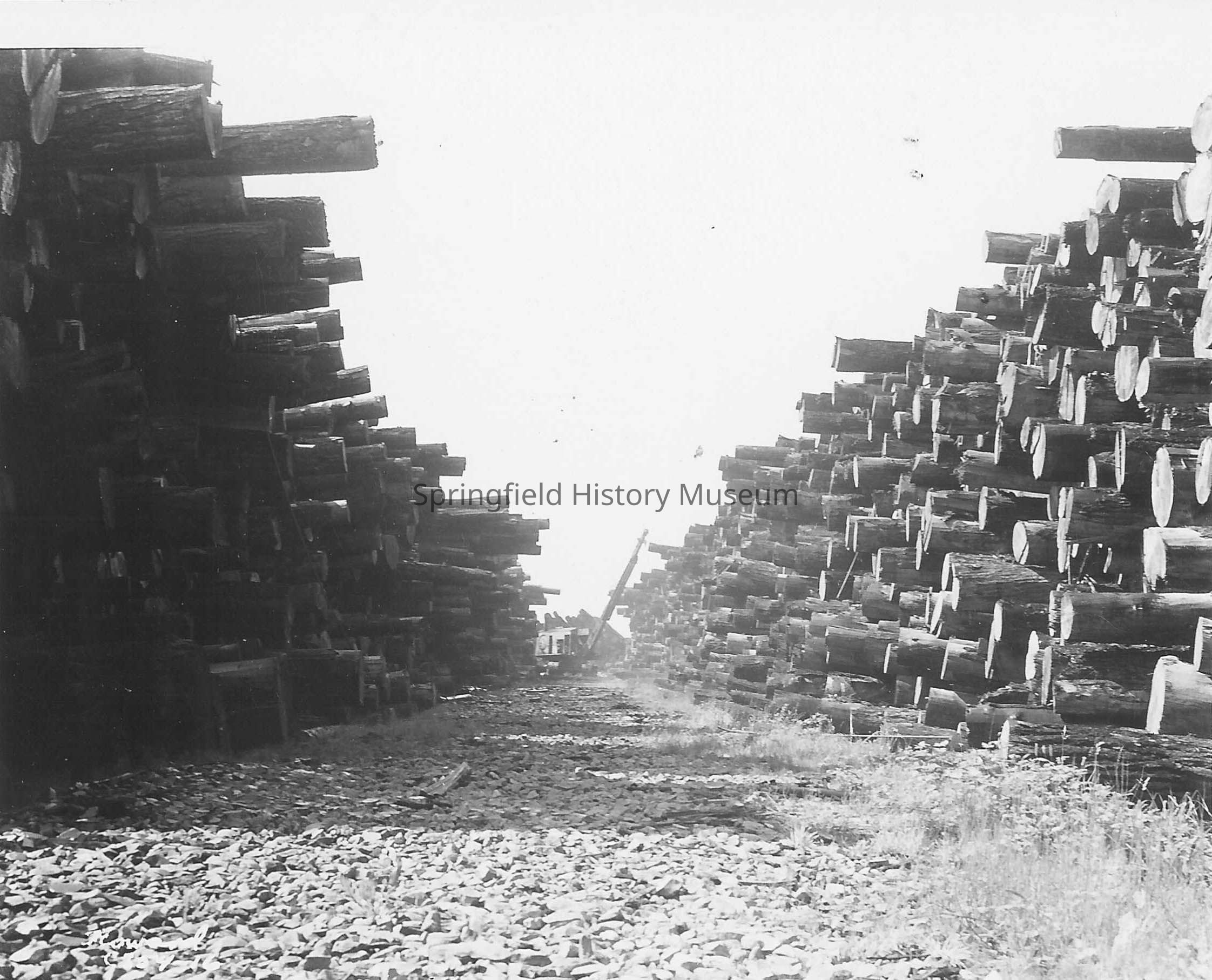 Log stacks at Rosboro pond, 21 September 1950. Heavy rock road between stacks. Marked Howard C354-16