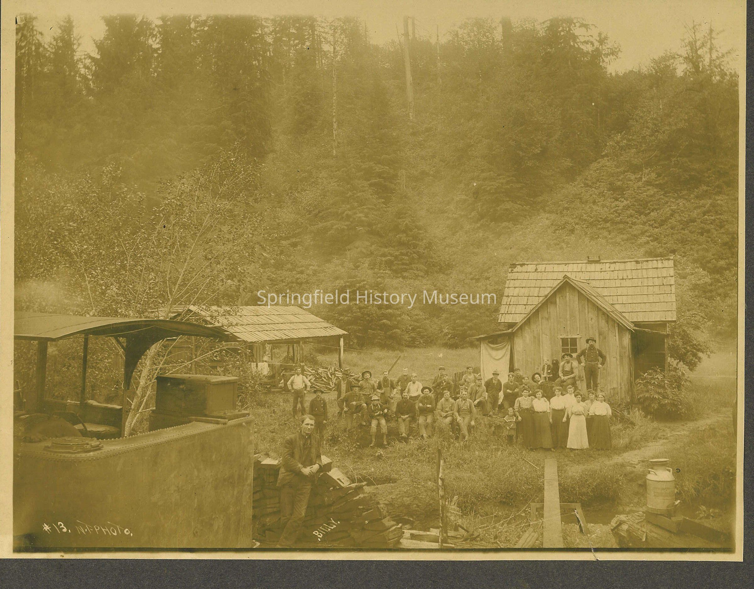 Logging camp with group of thirty-five people and a dog. Undated. Photo inscribed "#13. N.T. Photo." Name "Billy" is inscribed (on the negative) by man in foreground. Back is inscribed: "Taken at Skanockana, Washington where your dad used to work- 1907-1908"