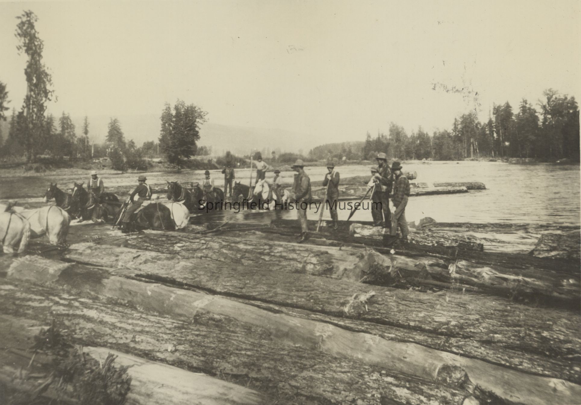 Logging, Logging Drive Crew, Middle Willamette River, Horses, Pleasant Hill Region, Jasper, Loggers, Logging--Transportation--Drives & Dams, Logging--Personnel, Logging--Transportation--Animal, Domesticated Animals--Horses, Waterways--Willamette River, Pleasant Hill Region--Jasper, People--Groups & Individuals