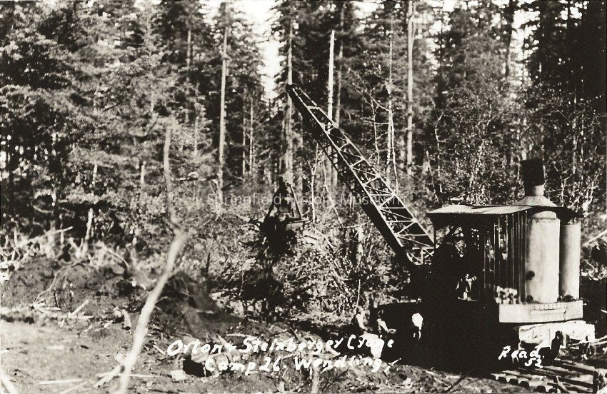 Written provenance: "Donkey with clam shovel. This was operated by Mike Palialak. It opened up all the roads, laid the foundation for the whole operation, all the spurs, miles of tracks, everything. He moved all the camps, worked it all through blocks and cables. If the trains had moved'em, the homes would have been pulled all apart. He moved ours 20 miles. By the end of the trip we were all prayin' it'd hold together. He was a special friend of mine. I remember he made me a water wheel: the water would turn the wheel. I played in the river with it for hours."Photograph Details