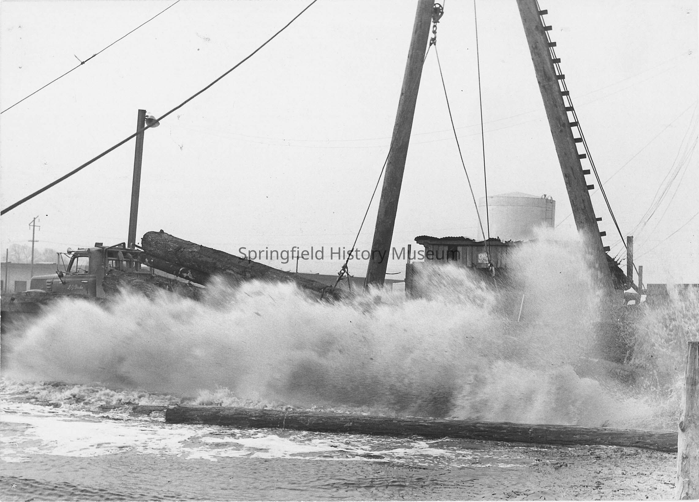 Logs being dumped into a mill pond from the back of a truck. The splash is so big you cannot see the logs, undatedCollection