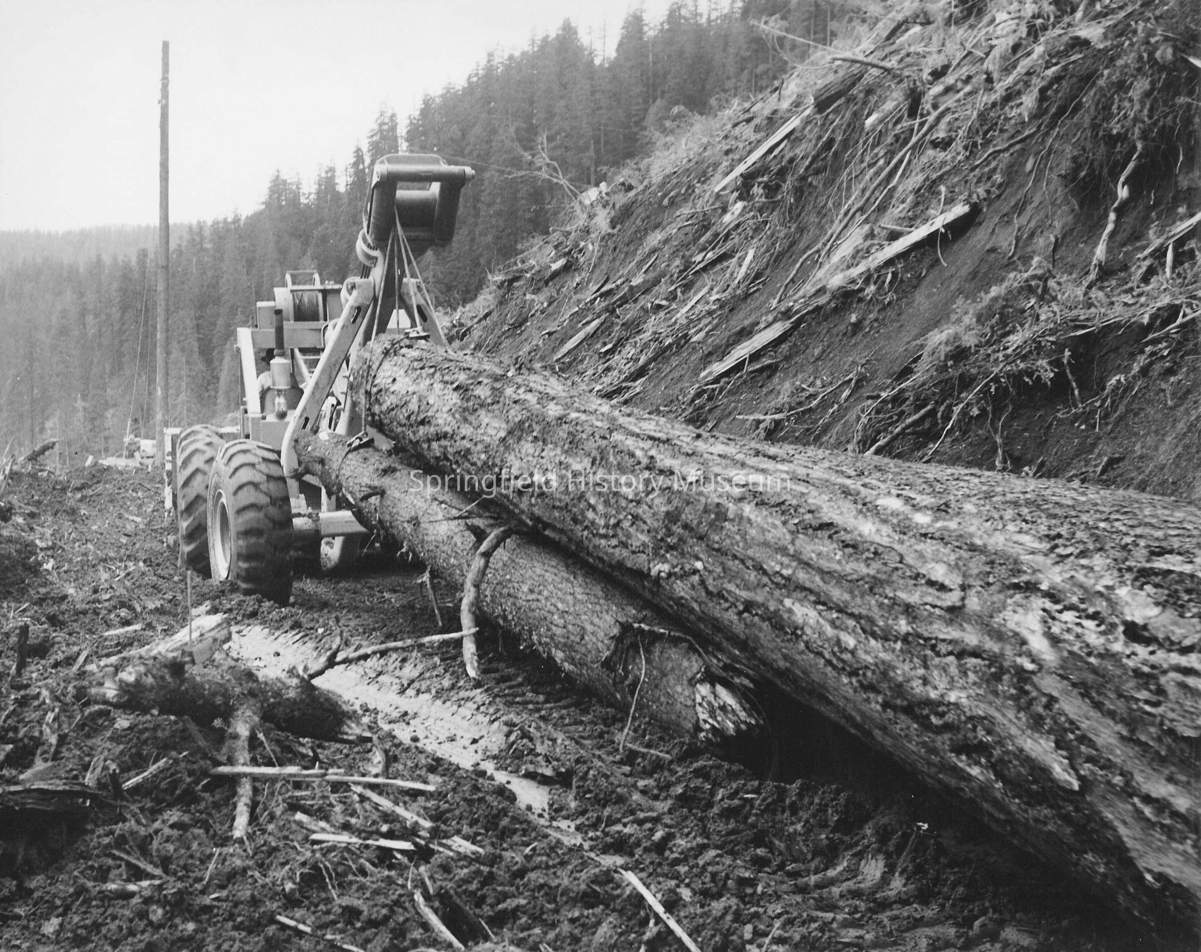 Photograph of moving logs on a mud road to a loading area with a skidder. Undated