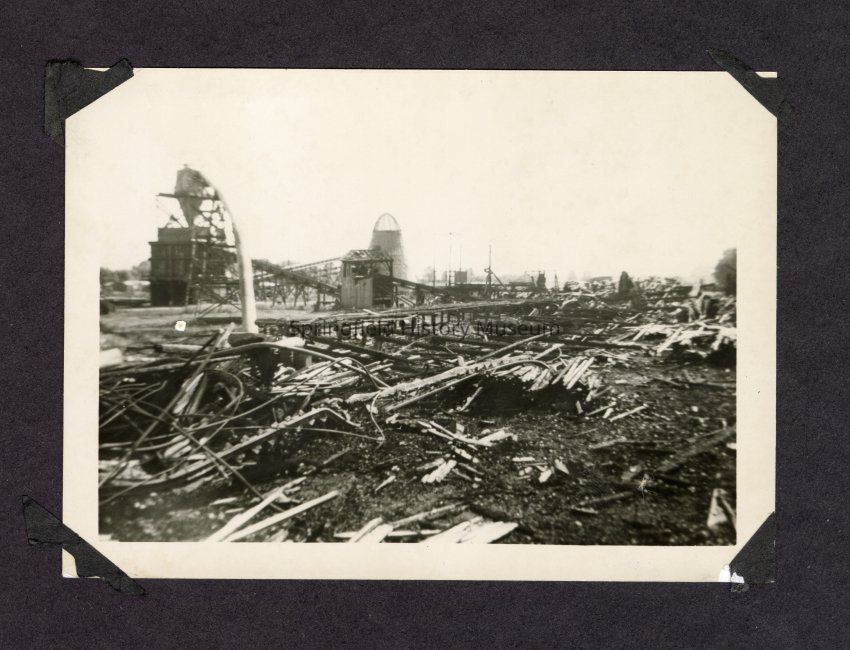 Photograph of twisted and scattered tracks and lumber, mill structures in background, most likely after Clear Fir Mill Fire, photo taken by John and Jim Woods,