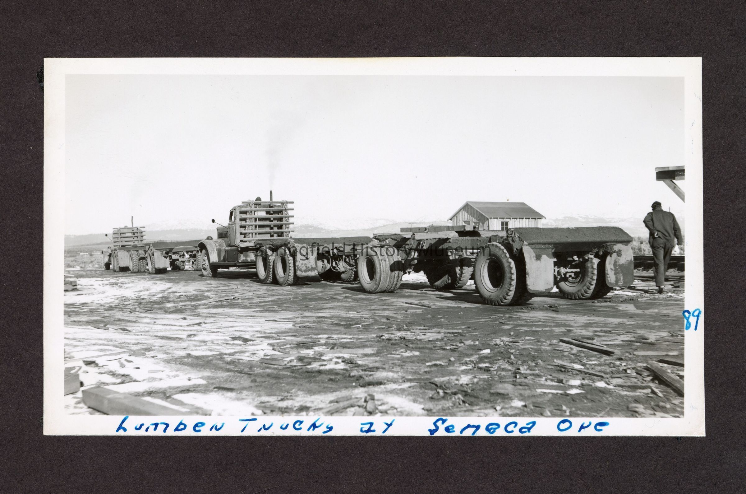 Photograph of "lumber trucks at Seneca, Ore," on side in pen" 89"