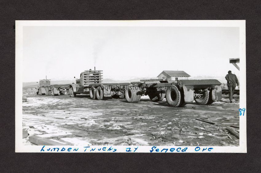 Photograph of lumber trucks at Seneca, Oregon