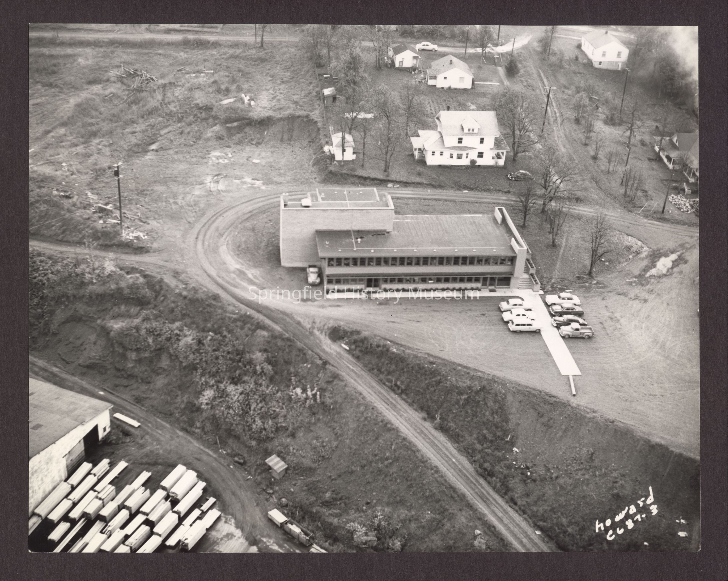 B&W Photo of lumber yard and office of unknown mill. Howard Studio C687-3