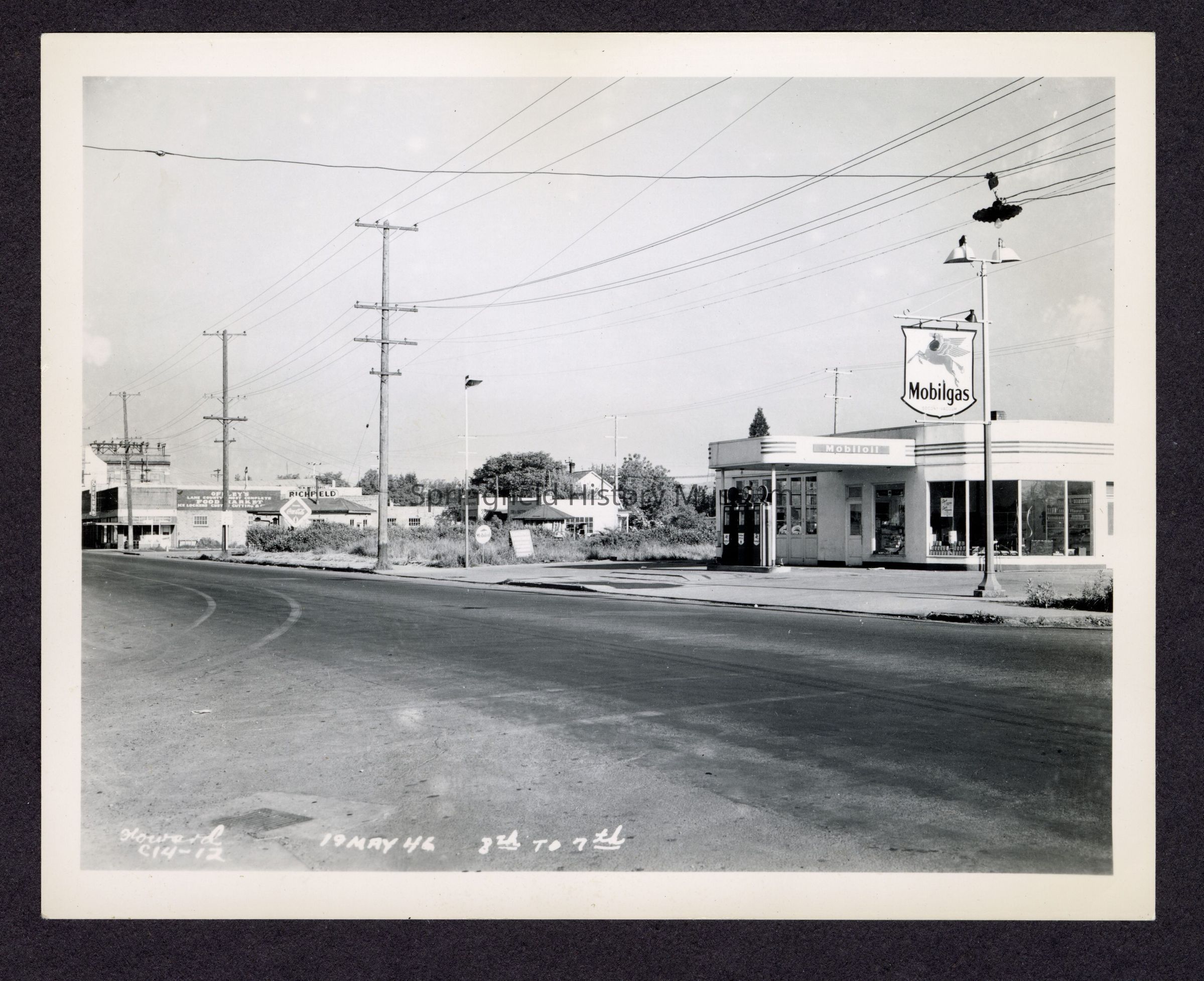 Photo of Main St. 8th looking to 7th Springfield, Oregon. May 19, 1946. Service station.Collection