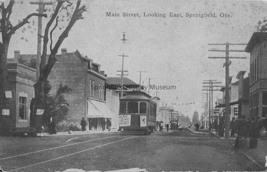 Three postcards, titled "Main Street, Looking East, Springfield, Ore.", circa 1910. Shows a streetcar, people on the sidewalks walking past buildings. Letter written on back of 2 of the postcards. Postmarked July 28, 1911. Published by W.J. Hill