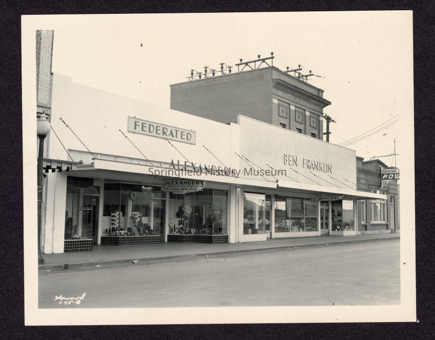 Photograph of Main St. Springfield, Oregon, Alexanders, Ben Franklin, Mountain Power buildings, Date unknown.Entry/Object ID