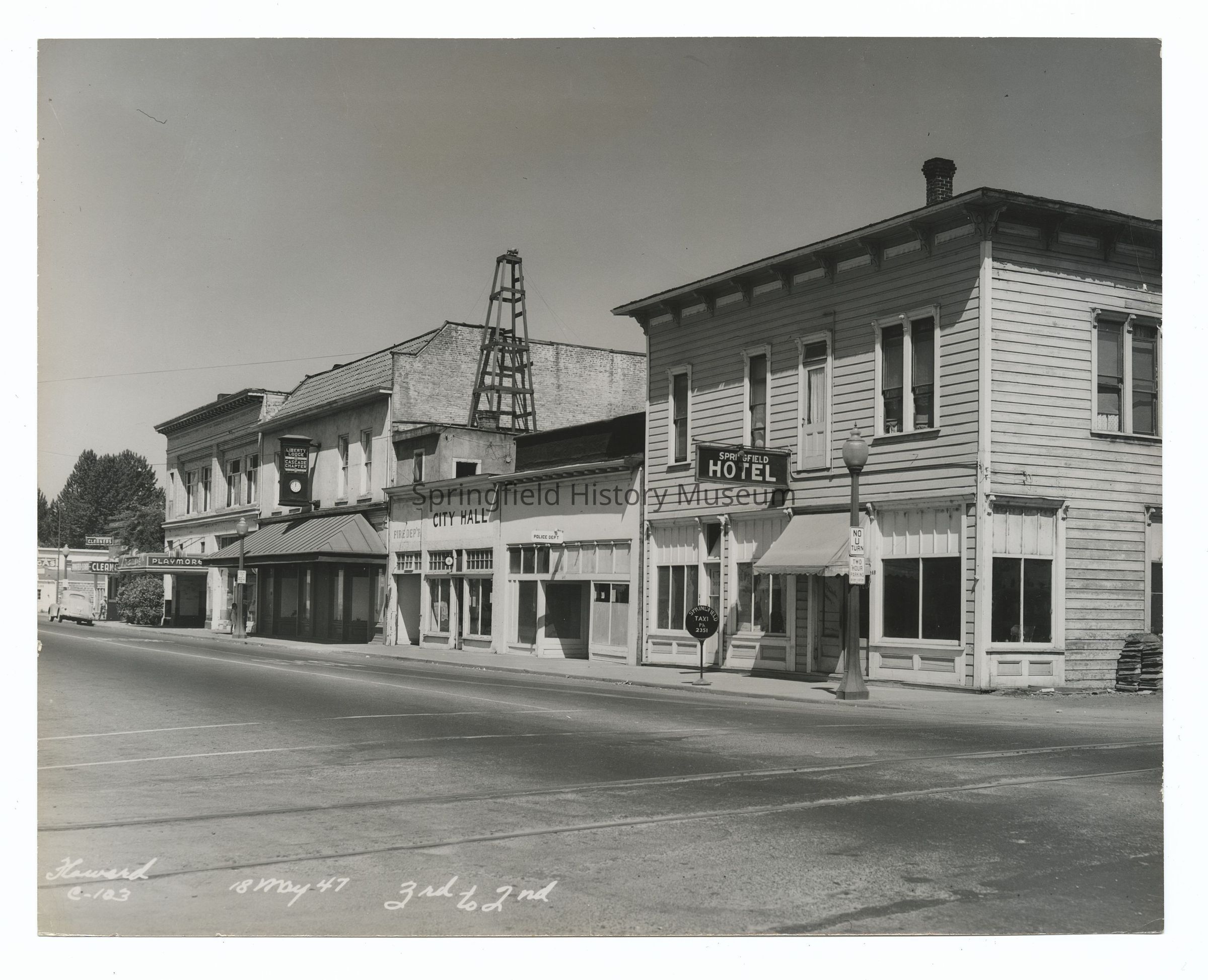 Photograph of Main Street, 3rd to 2nd, Springfield, May 18th 1947: depicting Springfield Hotel, City Hall, Liberty Lodge Cascade Chapter, Playmore, Cleaners, Gas stationPhotograph Details