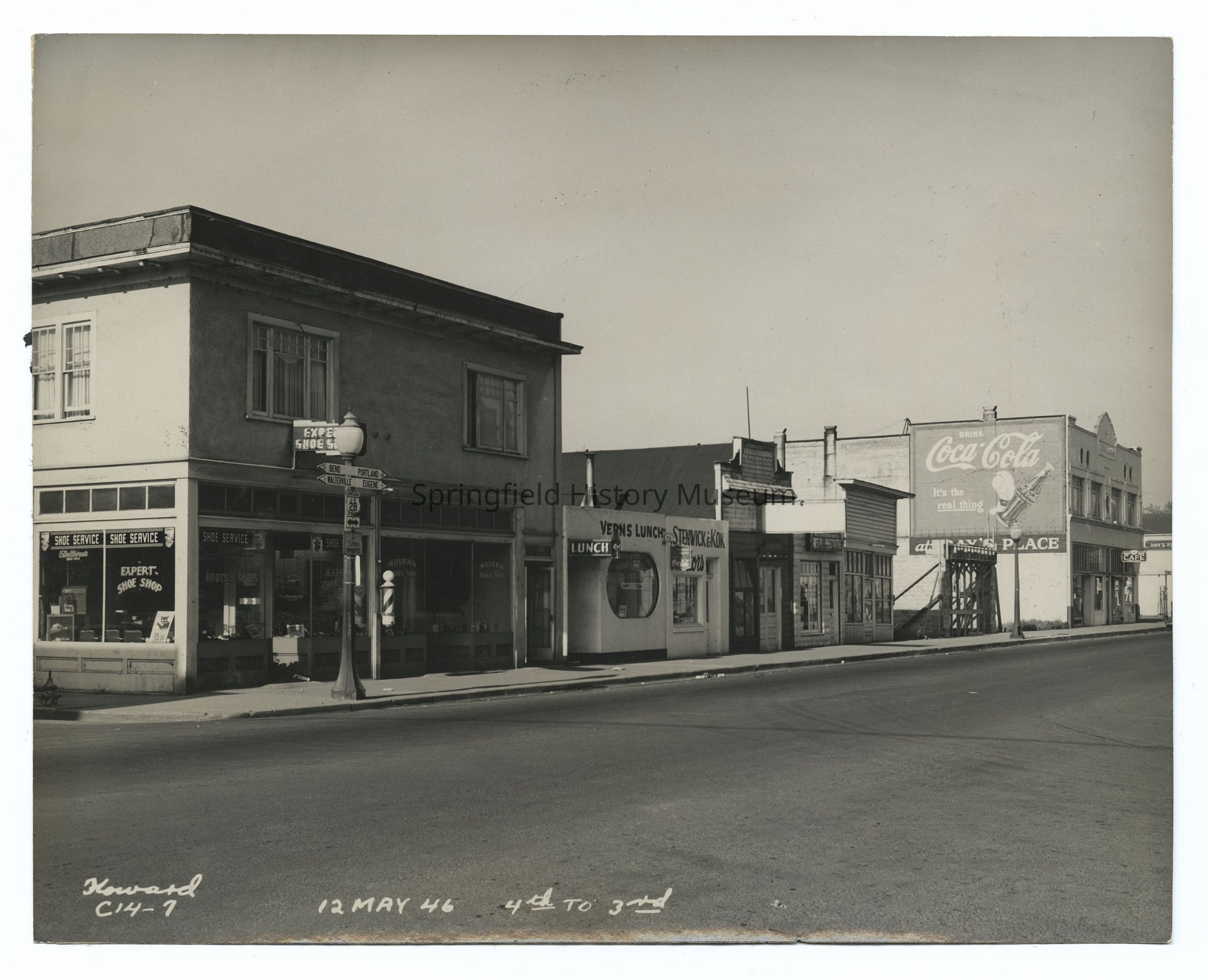 Photograph of Main Street, 4th to 3rd, Springfield, May 12th 1946, depicting: Expert shoe shop, barber shop, Verns Lunch, Stenwick and Kok Realtors, Busy Bee CaféPhotograph Details