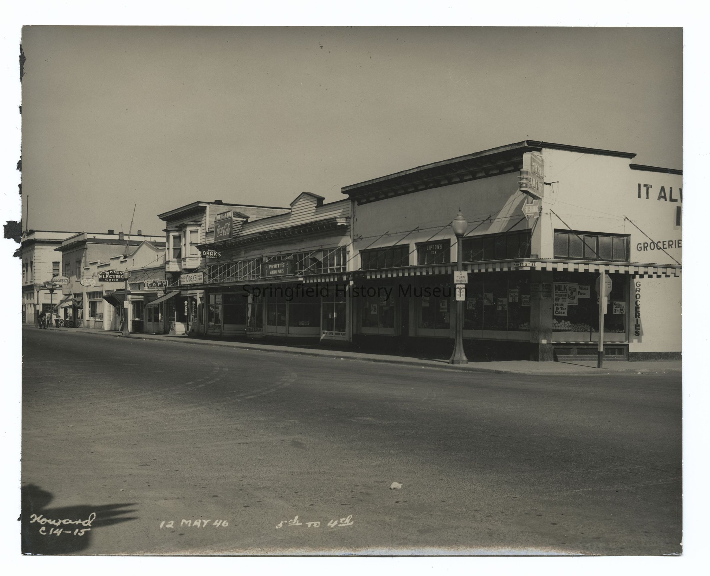 Photograph of Main Street, 5th to 4th, Springfield, May 12th 1946, showing: Irish and Murphy grocery store on the corner, Pruitt's General Plants, Obak's (Drinks, Pool), Irene's Café, Pimentel Electric Shop, Quick Lunch, Post OfficePhotograph Details