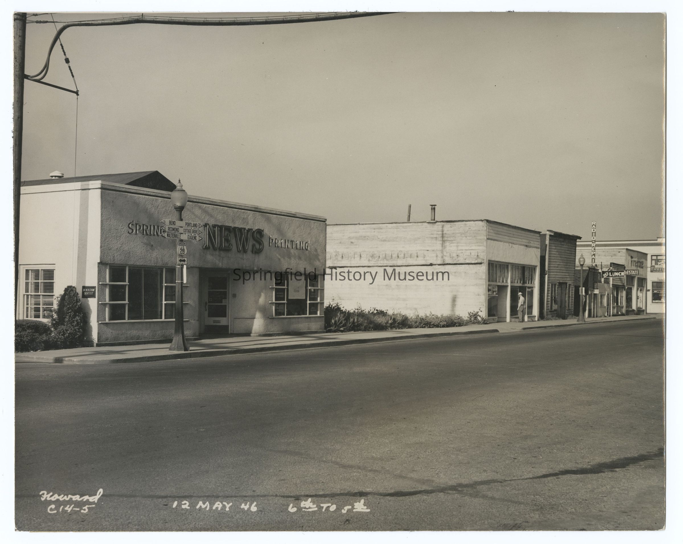 Photograph of Main Street, 6th to 5th, Springfield, 5/12/1946. Businesses on Main Street: Springfield News, Radio Repair, Ma's Lunch, Real Estate, FirestonePhotograph Details