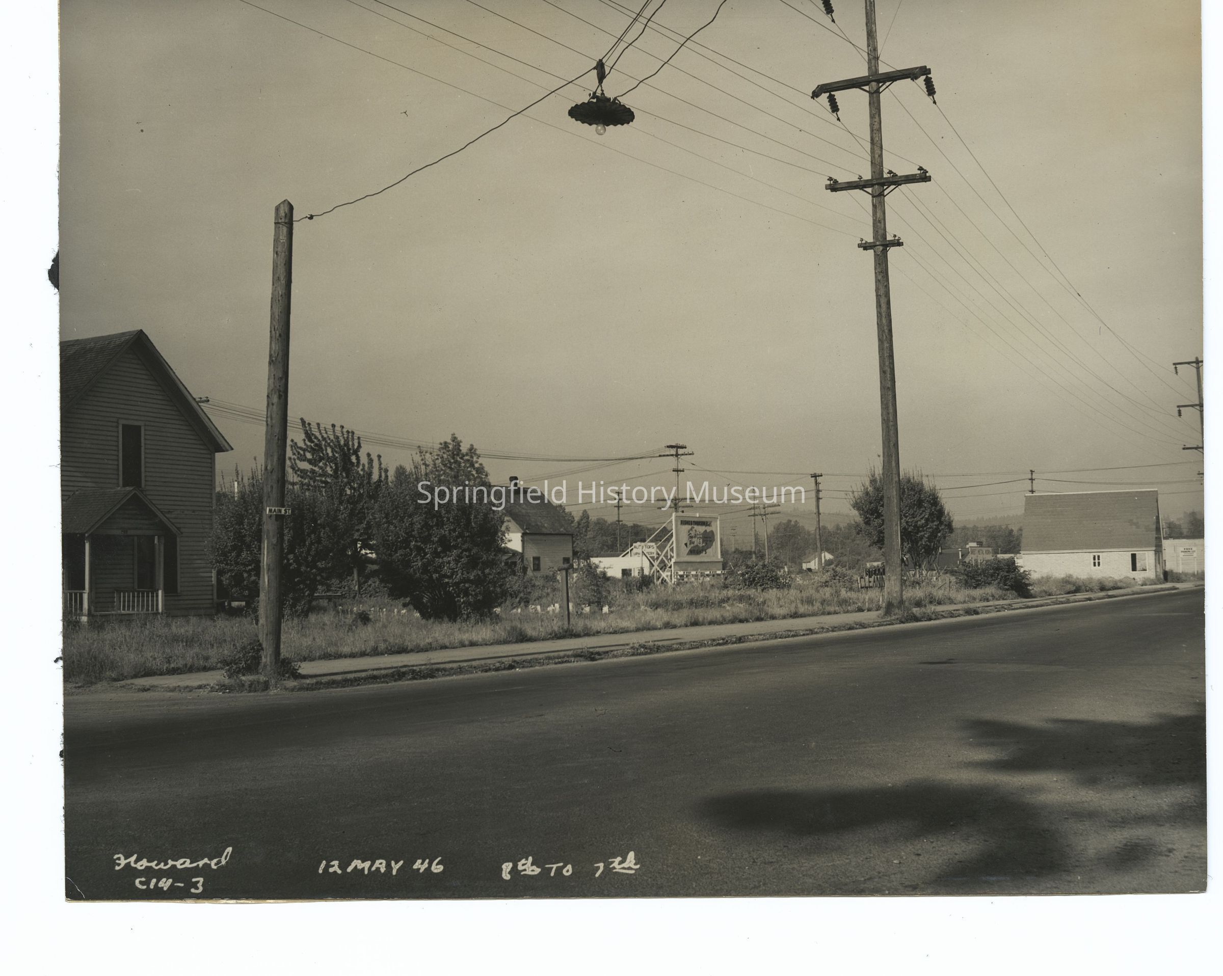 Photograph of Main Street, 8th to 7th, Springfield, May 12th 1946, shows: houses, empty lots, advertisement signsPhotograph Details
